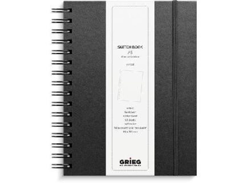 Beskrivning av Skissblock GRIEG A5 stående 150g svart Skissblock Grieg. Spiralbunden med hårt omslag, och med gummibandsförsluting i svart som håller innehållet på plats. A5 stående, 150g syrafritt samt perforerat papper, 60 blad, olinjerat, svart.