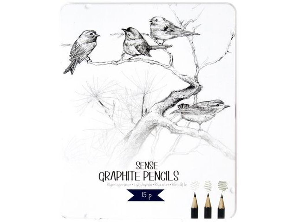 Beskrivning av Skisspennor SENSE 15/fp Sense skisspennor 15-P i plåtask. - Komplett uppsättning från mjuk till hård skisspenna - 9B-4H