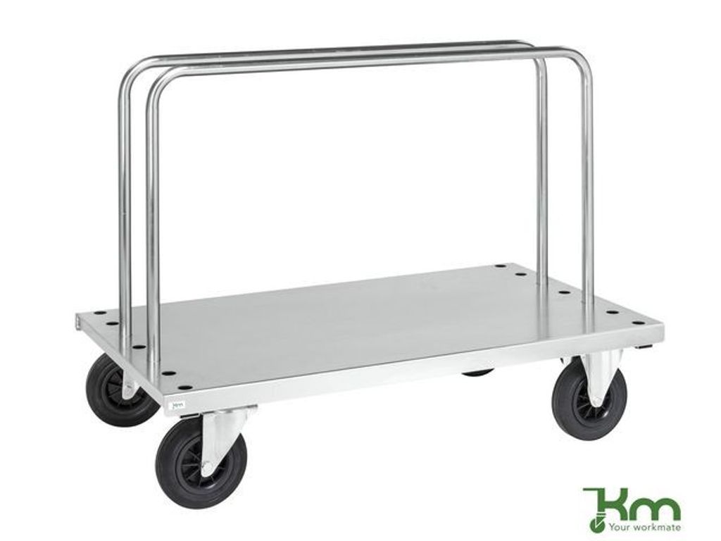 Praktisk skivvagn för de tyngre lasterna. Tillverkad av elförzinkad plåt. Med plats för 7 byglar, levereras med 2 flyttbara byglar. - Belastning: 500kg - Storlek: 1250 x 700 x 945mm (LxBxH) - Höjd till plattform: 265mm - Avstånd mellan byglar: 77mm - Gummihjul 200 x 50mm - Vagnens vikt: 44kg - Bromsade hjul: Nej - Hjultyp: 2 fasta, 2 länkhjul