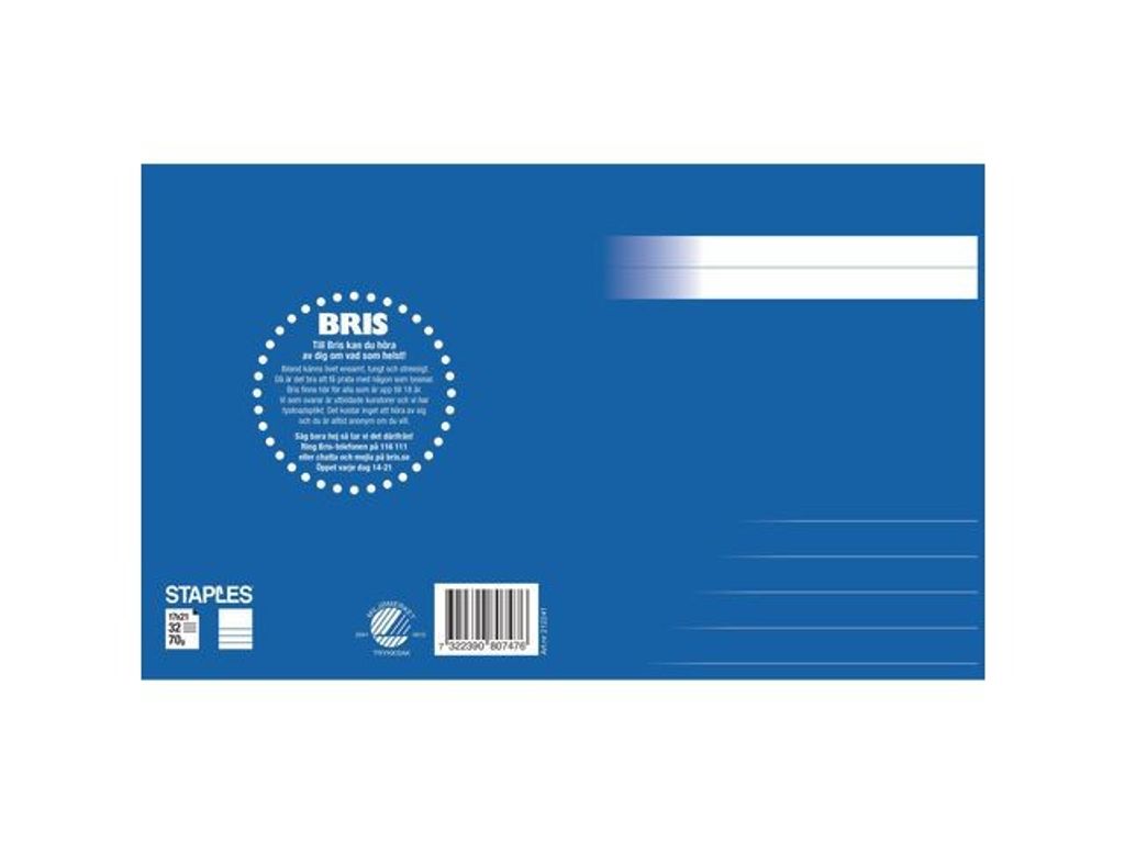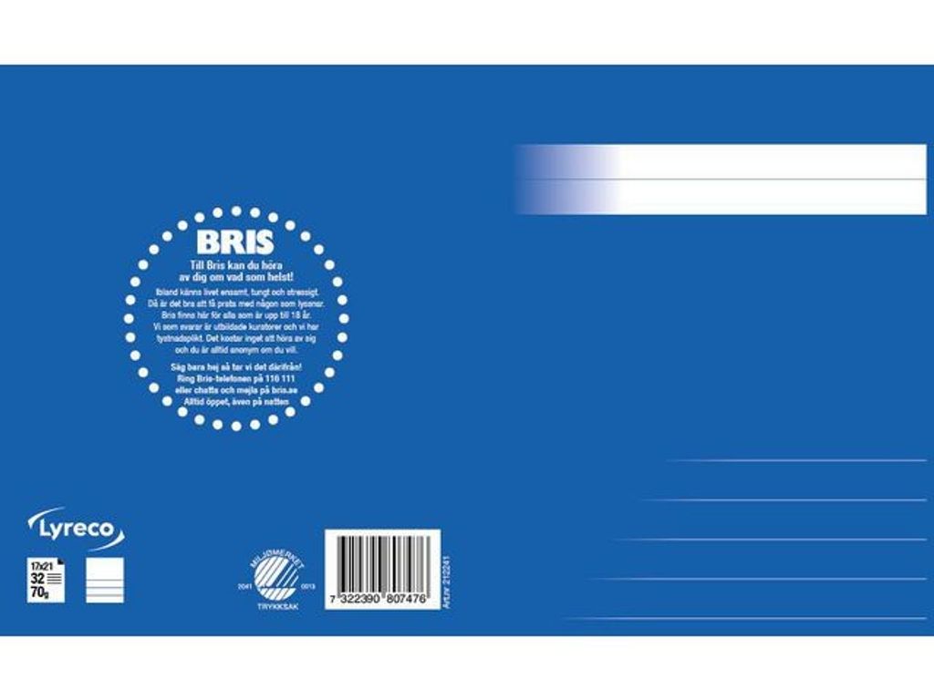 En stilren serie skriv- och räknehäften för alla åldrar. Linjerade, rutade och olinjerade varianter i olika storlekar och de härliga färger hjälper dig att skilja dem åt. Ett svanenmärkt skrivhäfte med övre ½ sida blank och nedre ½ sida linjerad med 14,5mm linjeavstånd. Format 17 x 21 cm. Tillsammans stödjer vi BRIS genom att 5 öre per sålt häfte ur denna serie går direkt till BRIS, Barnens Rätt i Samhället. - Format: 17x21 cm - Linjering: ½ sida blank ½ sida linjerad - Linjeavstånd: 14,5mm - Gramvikt: 70g - Antal blad: 32 - Färg: Blå - Svanen: Licensnummer 20410013 - BRIS: tillsammans stödjer vi BRIS Svanen: Licensnummer 20410013