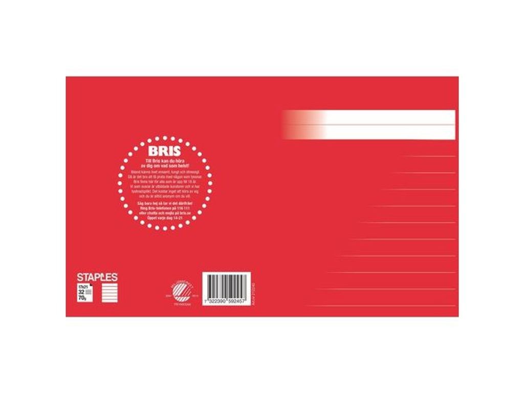 En stilren serie skriv- och räknehäften för alla åldrar. Linjerade, rutade och olinjerade varianter i olika storlekar och de härliga färger hjälper dig att skilja dem åt. Ett svanenmärkt, linjerat, skrivhäfte med 14,5 mm linjeavstånd i ett format på 17 x 21 cm. Tillsammans stödjer vi BRIS genom att 5 öre per sålt häfte ur denna serie går direkt till BRIS, Barnens Rätt i Samhället. - Format: 17x21 cm - Linjering: Linjerat - Linjeavstånd: 14,5mm - Gramvikt: 70g - Antal blad: 32 - Färg: Röd - Svanen: Licensnummer 20410013 - BRIS: tillsammans stödjer vi BRIS Svanen: Licensnummer 20410013