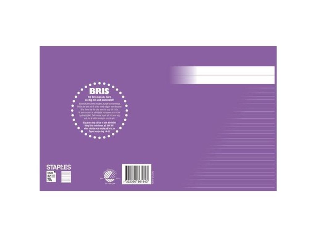 En stilren serie skriv- och räknehäften för alla åldrar. Linjerade, rutade och olinjerade varianter i olika storlekar och de härliga färger hjälper dig att skilja dem åt. Ett svanenmärkt, linjerat, skrivhäfte med 5+5+5+7mm linjeavstånd. Format 17 x 21 cm. Tillsammans stödjer vi BRIS genom att 5 öre per sålt häfte ur denna serie går direkt till BRIS, Barnens Rätt i Samhället. - Format: 17x21 cm - Linjering: Linjerad - Linjeavstånd: 5+5+5+7mm - Gramvikt: 70g - Antal blad: 32 - Färg: Lila - Svanen: Licensnummer 20410013 - BRIS: tillsammans stödjer vi BRIS Svanen: Licensnummer 20410013