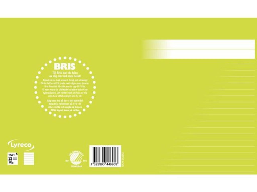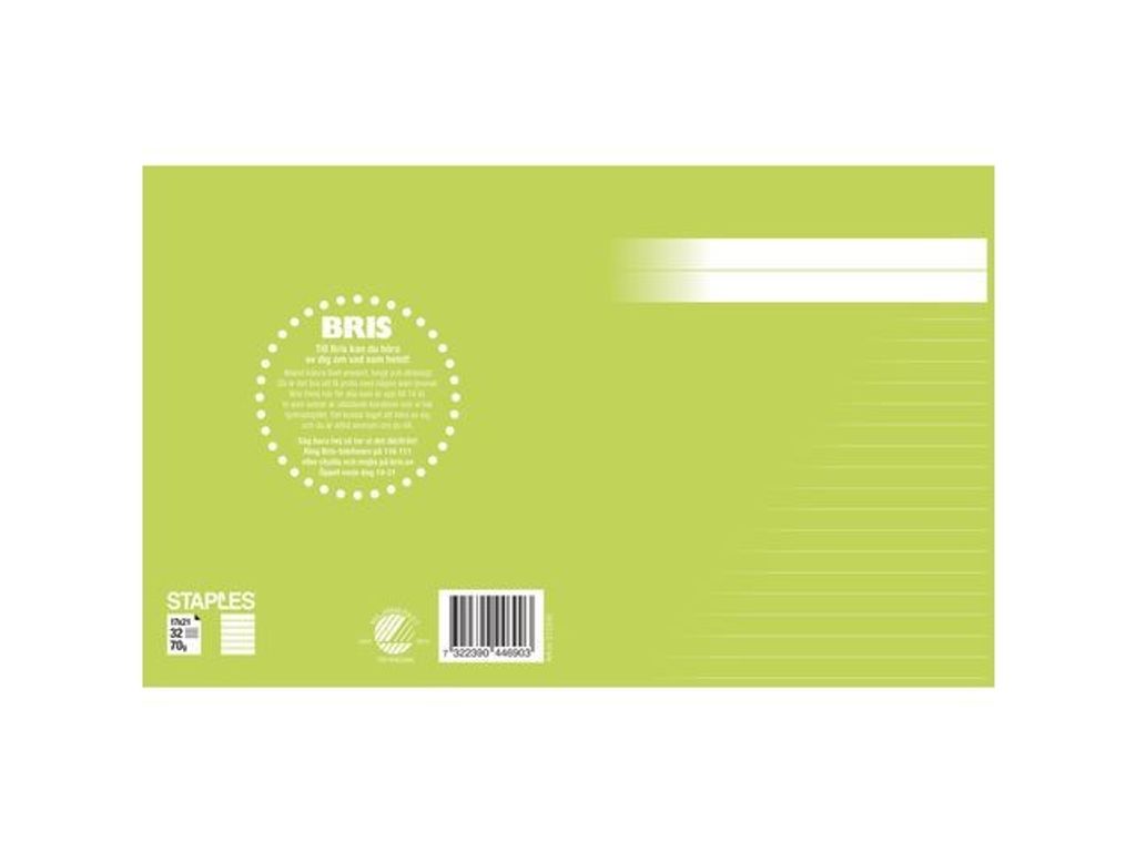 En stilren serie skriv- och räknehäften för alla åldrar. Linjerade, rutade och olinjerade varianter i olika storlekar och de härliga färger hjälper dig att skilja dem åt. Ett svanenmärkt, linjerat, skrivhäfte med 8,5mm linjeavstånd i ett format på 17 x 21 cm. Tillsammans stödjer vi BRIS genom att 5 öre per sålt häfte ur denna serie går direkt till BRIS, Barnens Rätt i Samhället. - Format: 17x21 cm - Linjering: Linjerad - Linjeavstånd: 8,5mm - Gramvikt: 70g - Antal blad: 32 - Färg: Ljusgrön - Svanen: Licensnummer 20410013 - BRIS: tillsammans stödjer vi BRIS Svanen: Licensnummer 20410013