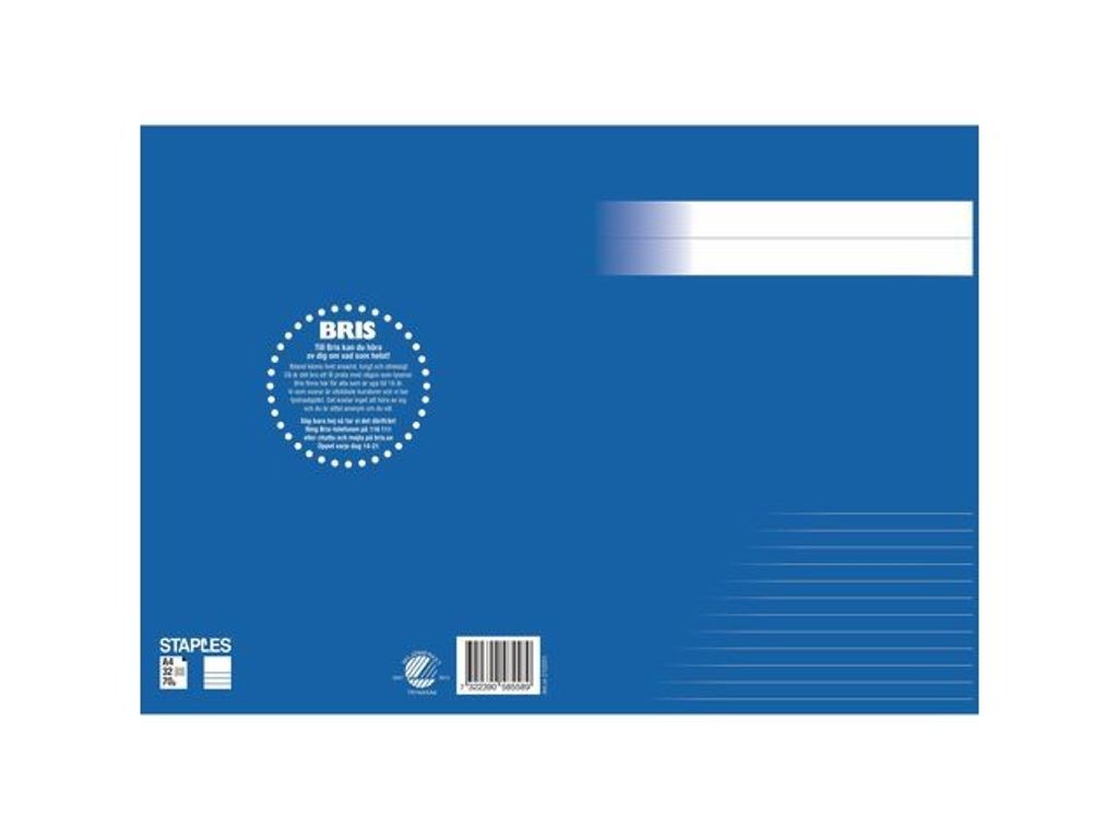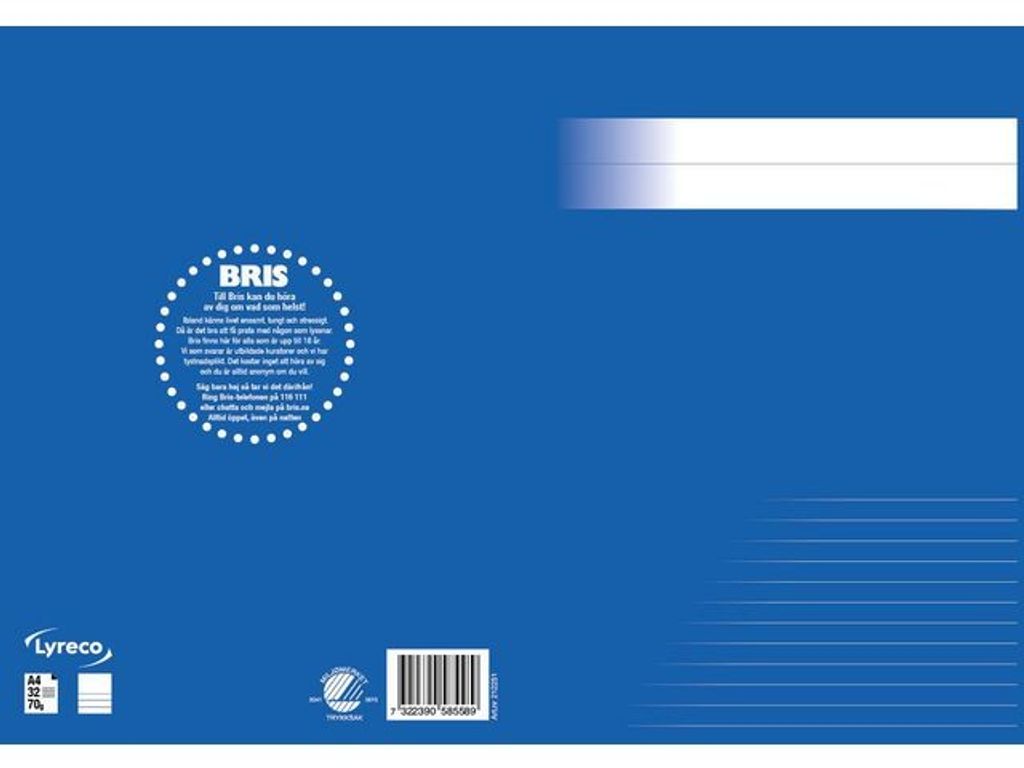 En stilren serie skriv- och räknehäften för alla åldrar. Linjerade, rutade och olinjerade varianter i olika storlekar och de härliga färger hjälper dig att skilja dem åt. Ett svanenmärkt skrivhäfte med övre ½ sida blank och nedre ½ sida linjerad med 8,5mm linjeavstånd. I format A4. Tillsammans stödjer vi BRIS genom att 5 öre per sålt häfte ur denna serie går direkt till BRIS, Barnens Rätt i Samhället. - Format: A4 - Linjering: ½ sida blank ½ sida linjerad - Linjeavstånd: 8,5mm - Gramvikt: 70g - Antal blad: 32 - Färg: Blå - Svanen: Licensnummer 20410013 - BRIS: tillsammans stödjer vi BRIS Svanen: Licensnummer 20410013
