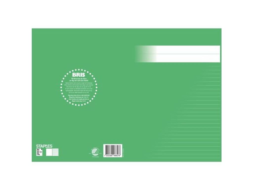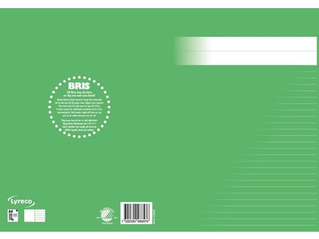 En stilren serie skriv- och räknehäften för alla åldrar. Linjerade, rutade och olinjerade varianter i olika storlekar och de härliga färger hjälper dig att skilja dem åt. Ett svanenmärkt skrivhäfte med varannan sida blank och varannan sida linjerad med ett linjeavstånd på 8,5 mm. I format A4. Tillsammans stödjer vi BRIS genom att 5 öre per sålt häfte ur denna serie går direkt till BRIS, Barnens Rätt i Samhället. - Format: A4 - Linjering: 1 blank/1 linjerad sida - Linjeavstånd: 8,5mm - Gramvikt: 70g - Antal blad: 32 - Färg: Grön - Svanen: Licensnummer 20410013 - BRIS: tillsammans stödjer vi BRIS Svanen: Licensnummer 20410013