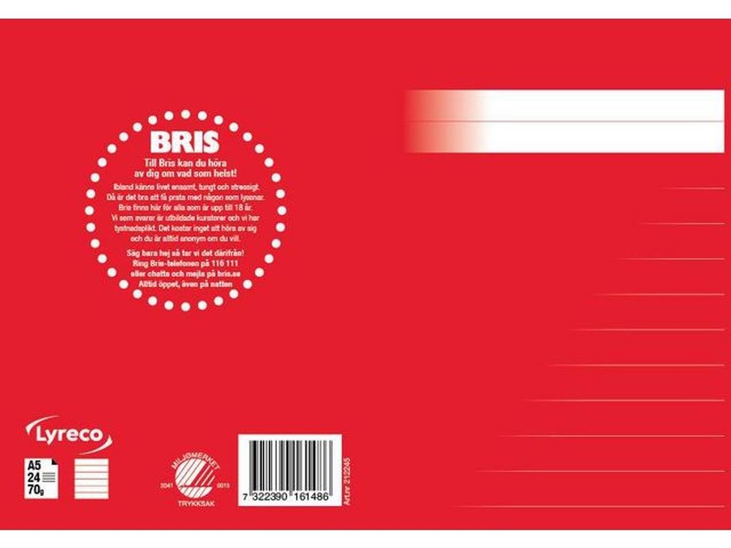 En stilren serie skriv- och räknehäften för alla åldrar. Linjerade, rutade och olinjerade varianter i olika storlekar och de härliga färger hjälper dig att skilja dem åt. Ett svanenmärkt, linjerat, skrivhäfte med 14,5mm linjeavstånd. I A5 format. Tillsammans stödjer vi BRIS genom att 5 öre per sålt häfte ur denna serie går direkt till BRIS, Barnens Rätt i Samhället. - Format: A5 - Linjering: Linjerad - Linjeavstånd: 14,5mm - Gramvikt: 70g - Antal blad: 24 - Färg: Röd - Svanen: Licensnummer 20410013 - BRIS: tillsammans stödjer vi BRIS Svanen: Licensnummer 20410013