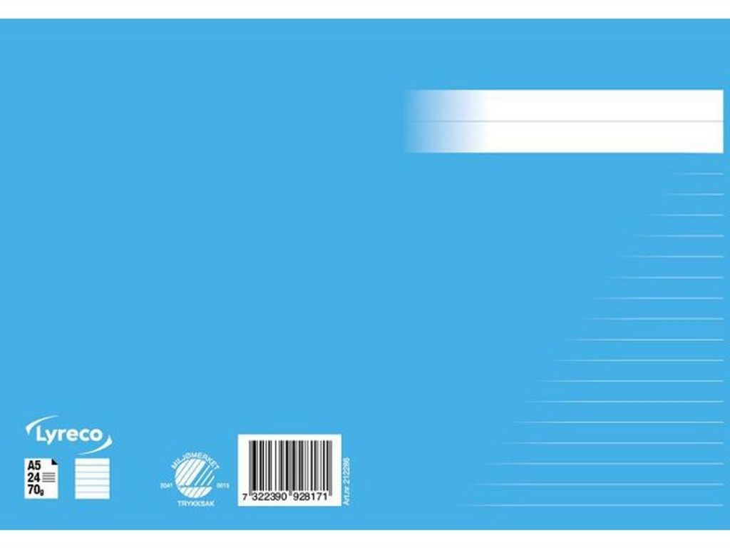 En stilren serie skriv- och räknehäften för alla åldrar. Linjerade, rutade och olinjerade varianter i olika storlekar och de härliga färger hjälper dig att skilja dem åt. Ett svanenmärkt, linjerat, skrivhäfte med 8,5mm linjeavstånd. I A5 format. - Format: A5 - Linjering: Linjerat - Linjeavstånd: 8,5mm - Gramvikt: 70g - Antal blad: 24 - Färg: Mellanblå - Svanen: Licensnummer 20410013 Svanen: Licensnummer 20410013