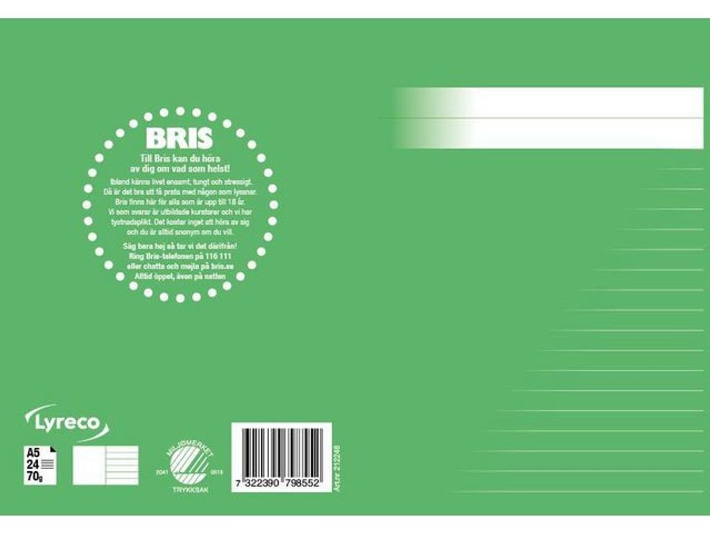 En stilren serie skriv- och räknehäften för alla åldrar. Linjerade, rutade och olinjerade varianter i olika storlekar och de härliga färger hjälper dig att skilja dem åt. Ett svanenmärkt skrivhäfte med varannan sida olinjerat och varannan linjerat med 8,5 mm linjeavstånd. I format A5. Tillsammans stödjer vi BRIS genom att 5 öre per sålt häfte ur denna serie går direkt till BRIS, Barnens Rätt i Samhället. - Format: A5 - Linjering: skrivhäfte med varannan sida blank och varannan sida linjerad sida - Linjeavstånd: 8,5mm - Gramvikt: 70g - Antal blad: 24 - Färg: Grön - Svanen: Licensnummer 20410013 - BRIS: tillsammans stödjer vi BRIS Svanen: Licensnummer 20410013