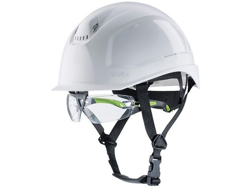 Skyddshjälm med tre inställbara ventilationsöppningar som släpper in luft och bidrar till temperaturregleringen. Ett kortare brätte ger bredare synfält uppåt och mer rörelsefrihet. Euroslotadaptrar (30 mm) för montering av hörselskydd. Med rattjustering och pannlampsfäste. Levereras med 4-punkts hakband samt skyddsglasögon UVEX 9192 Pheos. - Godkända enligt: EN 397 - Inställningsområde: 52-61cm - Vikt: 441g