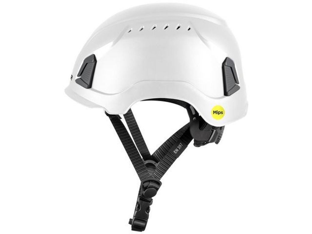 Innovativ industrihjälm utrustad med integrerad MIPS-teknik. Smarta klickfästen för pannlampa, hörselskydd, visir, visirskydd och nackskydd. Inga skruvar eller adaptrar behövs. 12 ventilationshål för en behaglig arbetsmiljö och rattjustering för smidig justering av storlek, passar XS-XXL (53-63cm). Ytterskal av polypropylen för låg vikt och innerskal av EPS för god komfort och stöttålighet. Absorberande vaddering för hög komfort som går att tvätta eller byta ut för att hålla hjälmen fräsch. Fyrpunktshakband speciellt utformat för att passa tillsammans med hörselskydd, hakbandet är både tvätt- och utbytbart. Kan förses med anpassat reflexkit. Rejäla lampclips som enkelt går att byta ut vid behov. Vad är MIPS? Mips är världsledande specialister på hjälmbaserad säkerhet och därmed skydd av hjärnan. Dess unika och patenterade säkerhetssystem utgår från ett lågfriktionslager som är placerat inuti hjälmen mellan huvudet och hjälmens yttre skal, för att vid vissa sneda islag låta hjälmen röra sig 10-15 mm i förhållande till huvudet i alla riktningar. Syftet är att minska den farliga rotationsrörelse som hjärnan kan utsättas för om du ramlar eller får ett slag mot huvudet. Mips-systemet är utvecklat för att minska rotationsenergin, vilket i sin tur kan reducera risken för hjärnskakning och andra skador på hjärnan. - Överensstämmer med: EN 397 - Vikt: 419g - Färg: vit