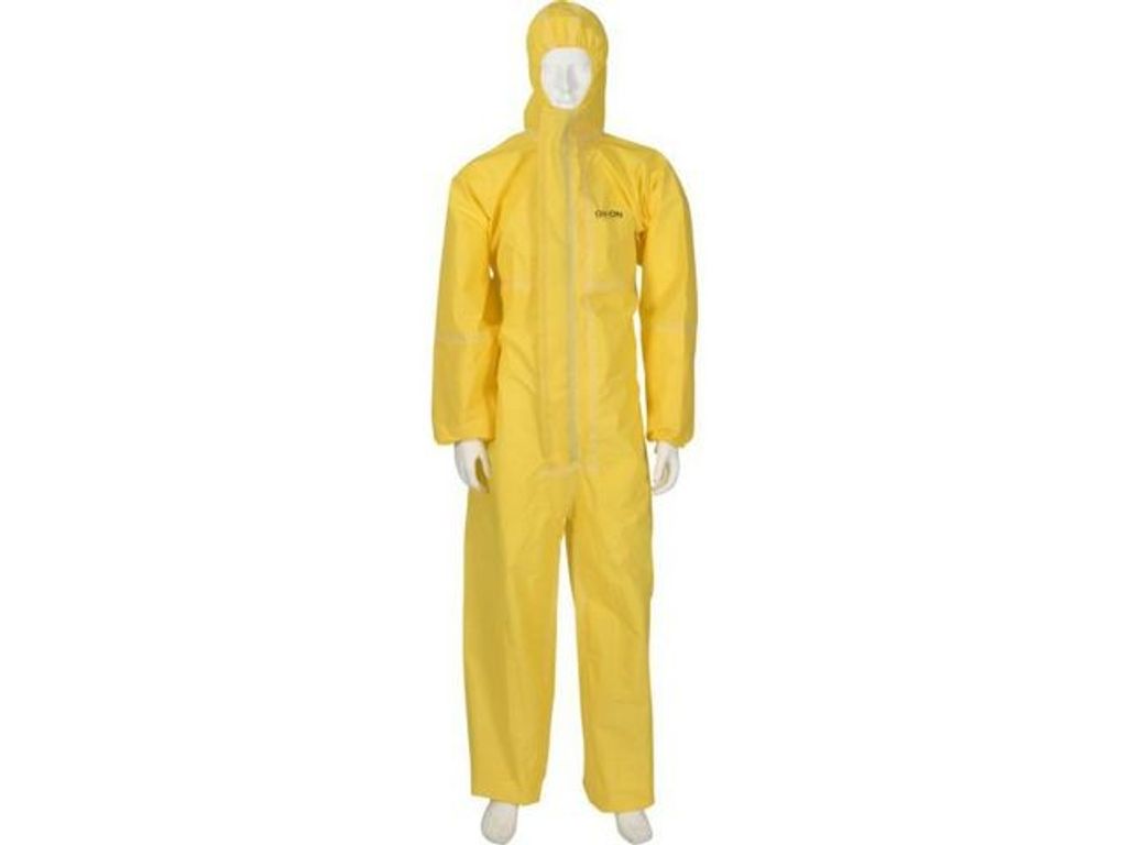 OX-ON Coverall Chem Comfort är en extremt slitstark och välsittande vätsketät gul skyddsdräkt med huva. Dräkten är tillverkad i ovävd polypropen och har en filmbeläggning av polyeten. Det gör att den lämpar sig för de allra flesta arbetsuppgifter innehållande vätskor, kemikalier och läkemedel. Det är en mycket bekväm och exklusiv skyddsdräkt för dig som vill ha den bästa kvalitetsutrustningen. Resåren runt huvan, i midjan och vid ärm- och benslut gör dräkten tätslutande och säkerställer optimal passform och komfort vid användning. Den är vidare utrustad med dubbel dragkedja, övertäckt, samt tumöglor som håller ärmarna på plats. Skyddsdräkten har värmeförseglade svetsade sömmar. OX-ON Coverall Chem Comfort är godkänd som typ 3, 4, 5 och 6. Det innebär följande: Typ 3: Vätsketät – högtryck. Dräkten skyddar, även i sömmarna, mot starka och riktade strålar av flytande kemiska vätskor. Typ 4: Vätsketät. Dräkten skyddar mot flytande kemikalier – även i sömmarna, där man är extra utsatt. Typ 5: Dammpartiklar. Dräkten skyddar hela kroppen mot luftburna, fasta partiklar. Typ 6: Vätskestänk. Dräkten skyddar i begränsad utsträckning mot lätta stänk av flytande kemikalier.