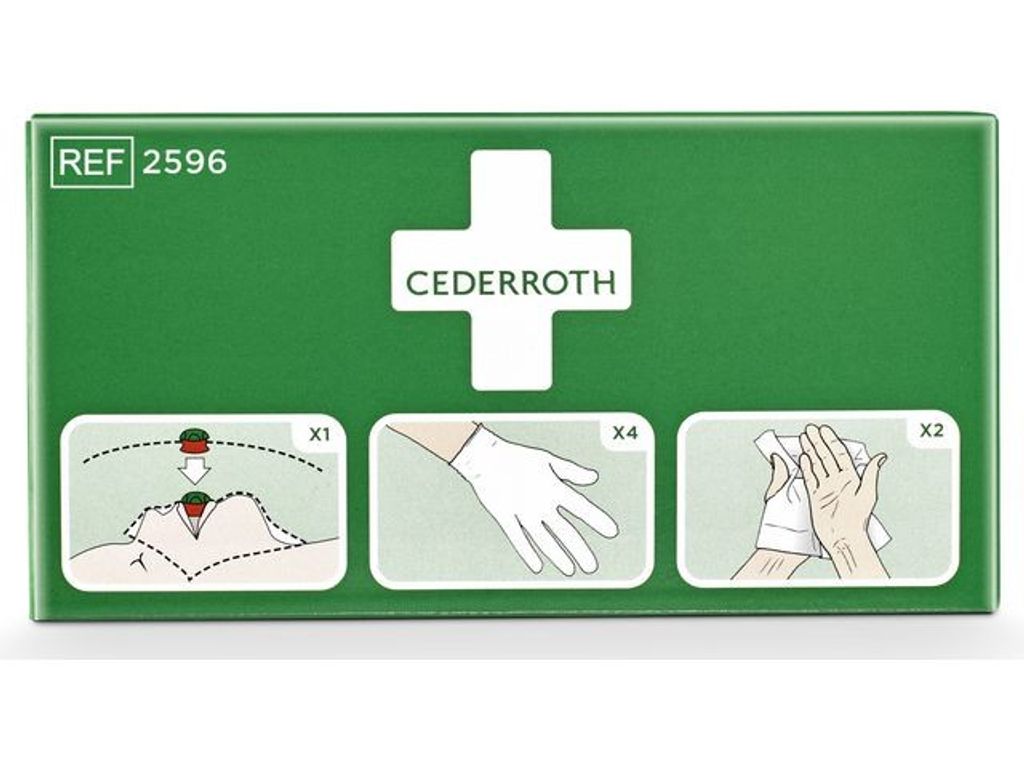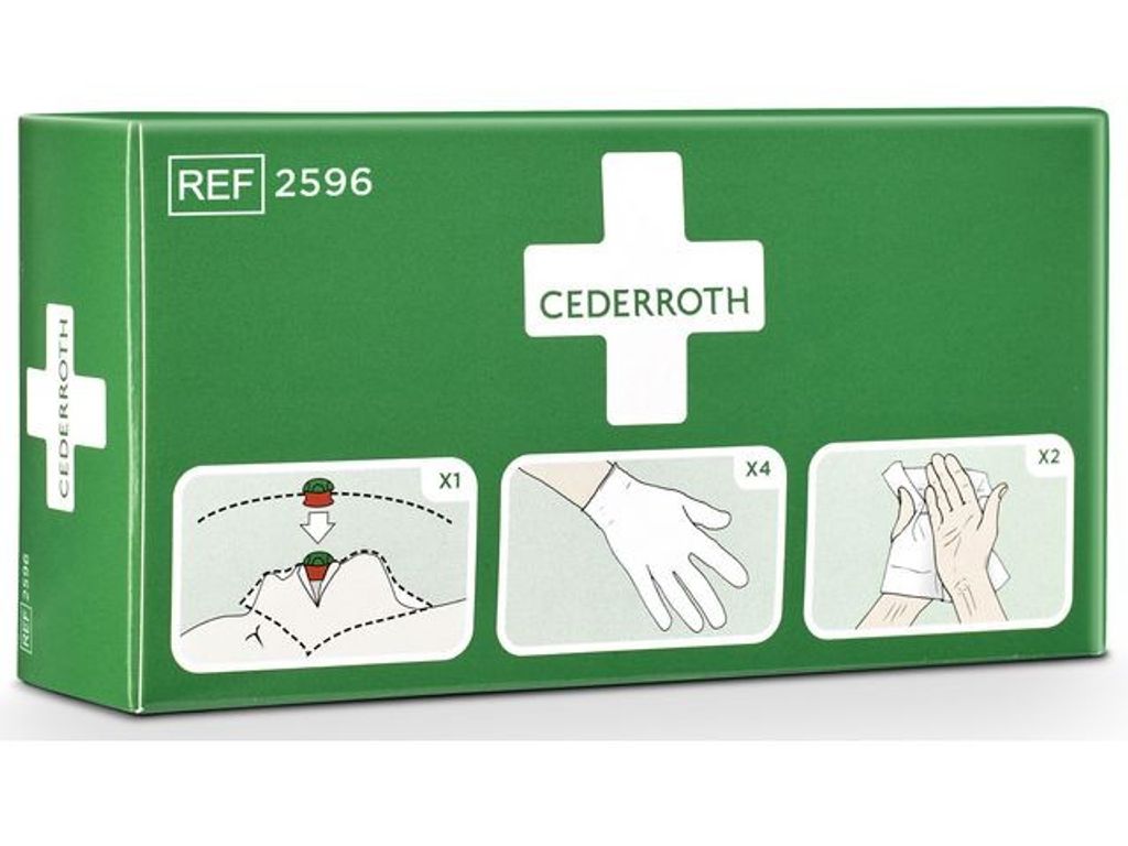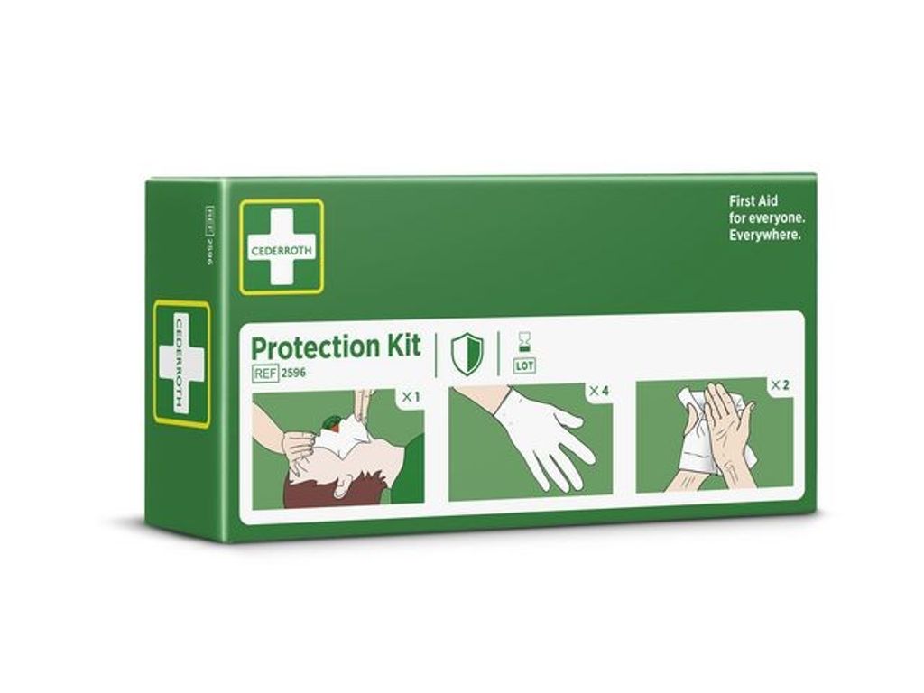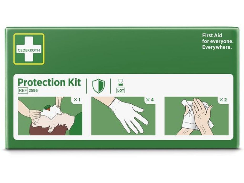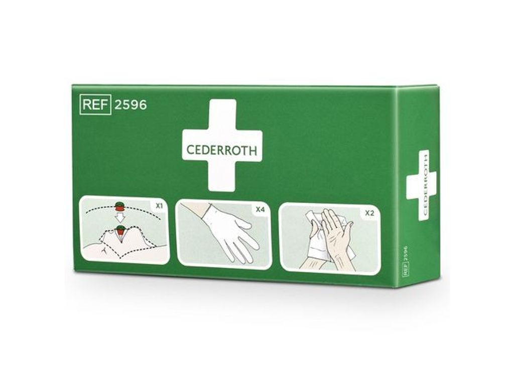Cederroth Skyddspaket innehåller andningsmask, handskar och sårtvättare. Skyddspaketet är ett hjälpmedel för att ge mun-mot-mun-andning på rätt sätt samtidigt som det förhindrar kontakt mellan hjälpare och skadad.Cederroths andningsmask är försedd med backventil. På skyddsduken finns tydliga instruktioner i färg. - Innehåll: - 1 st Andningsmask med backventil - 4 st Handskar - 2 st Cederroth Safety Hand Cleanser (innehåller 70% alkohol)