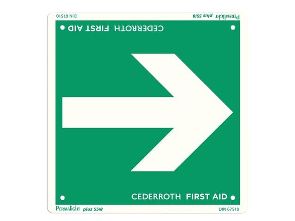 En dubbelsidig varselskylt med en 'riktningspil' som används för vägledning till en första hjälpen station om olyckan är framme. Efterlysande varselskylt i hårdplast. Skylten lyser i mörkret efter uppladdning i dagsljus eller annan ljuskälla. Går att montera som en flaggskylt eller hängande från taket. - Dubbelsidig - Mått: 20 x 20 cm - Färg: Grön/vit
