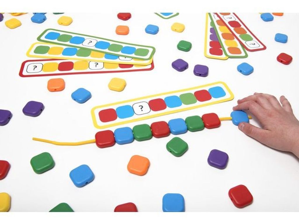 Kit med snörpärlor som även innehåller snören och dubbelsidiga arbetskort. Denna uppsättning med pärlor och snören är idealisk för undervisning i mönster samtidigt som man utvecklar sin finmotorik. Barnet väljer ett arbetskort och utför sekvensen från kort genom att trä pärlor i motsvarande sekvens på snöret. Korten är färgkodade med 3 nivåer, och varje kort innehåller 2-3 färger och 1-2 pärlutrymmen att själv fylla på. - Innehåller: 96 pärlor, 12 snören och 18 stycken dubbelsidiga arbetskort - Tillverkat av: Polystyren - Rekommenderas från: 3+ år Varning. Lämpar sig inte för barn under 3 år