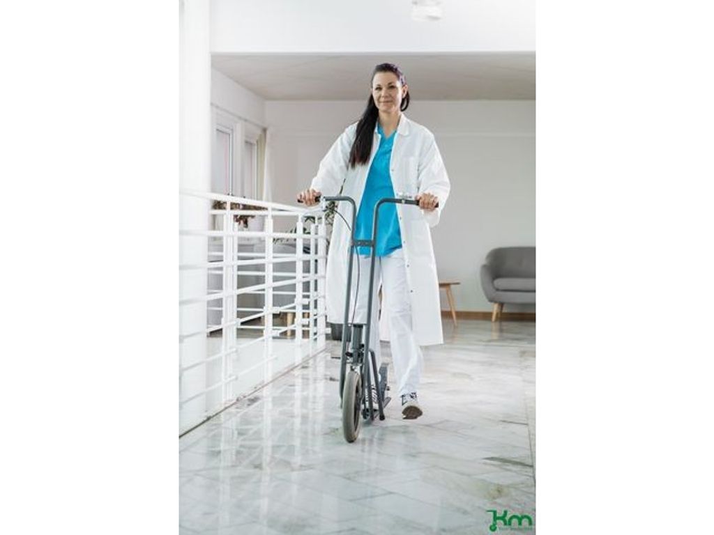 Sparkcykel för snabb och säker förflyttning mellan arbetsplatser. Med gummerade handtag för ergonomiskt grepp samt en ringklocka. Fotplattan är försedd med en ansti-slip yta för säker fotplacering. Max hastighet är 10km/h. Kräver inga speciella säkerhetsföreskrifter eller underhåll. Obs! Skall endast användas på plan mark, ej nedför för backar. - Belastning: 150kg - Storlek: 1230 x 645 x 1070mm (LxBxH) - Färg: Mörkgrå - Vikt: 17,5kg - Bromsade hjul: Ja - Hjultyp: Luftgummihjul