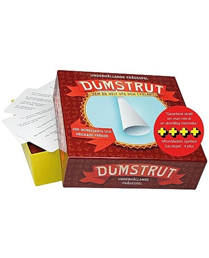 Hur många städer i världen heter Paris? Hur länge kan en delfin hålla andan? Hur högt upp i luften kan popcorn hoppa när man poppar dem och hur lång är den längsta bilkö som någonsin uppstått? Dumstrut är ett helkul och underhållande spel med över 400 frågor som alla har en sak gemensamt - de är vrickade, lustiga och nästan omöjliga att svara helt rätt på. Spelidén är lika enkel som underhållande. Här gäller det att tänka till och undvika motspelarnas 'Dumstrut'-kort genom att hamna så nära det korrekta svaret som möjligt. Håll tungan rätt i mun och spela ut ditt eget 'Dumstrut'-kort till den du tror är längst ifrån och roffa år dig massor av poäng. Det perfekta spelet för alla som älskar meningslösa fakta, skratt och knäppa gissningar! Ett verkligt underhållande spel för festen, hemmakvällen eller middagen.