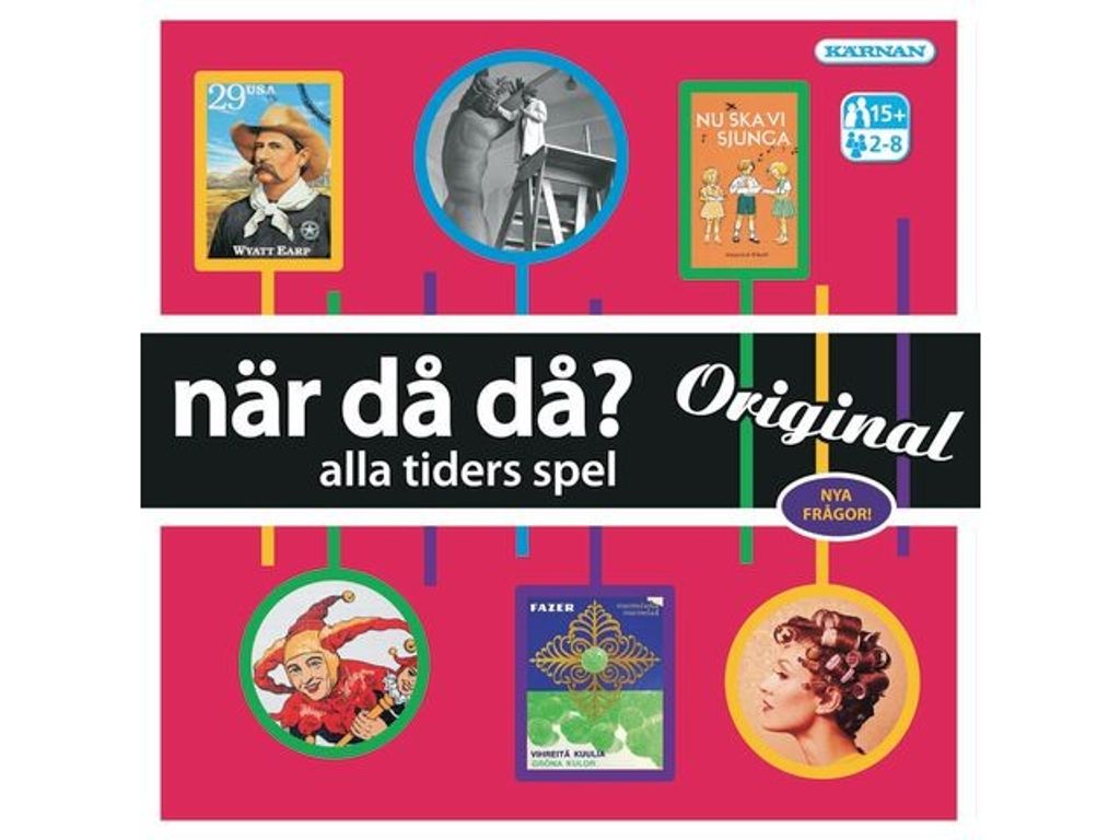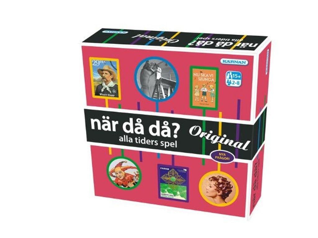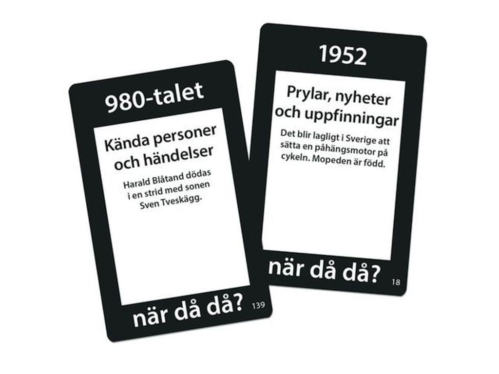 Roligt och kunskapshöjande spel. I spelet När då då så turas man om att ta kort och bilda en tidslinje med tio olika händelser från tideräkningens början fram till idag. Sätt händelser, personer, platser eller prylar i rätt tidsföljd. Började till exempel Marabou tillverka tuggummit Toy före eller efter det att Ingemar Stenmark vann sin första världscupseger? Du behöver inte kunna årtalen, utan endast kunna placera dem i rätt förhållande till varandra. Du kan chansa på att vinna flera kort åt gången och samtidigt riskera att förlora alla eller spela säkert och vinna ett kort åt gången. Den som först får tio kort vinner spelet. - För 2-8 spelare - Från 15 år Varning. Lämpar sig inte för barn under 3 år
