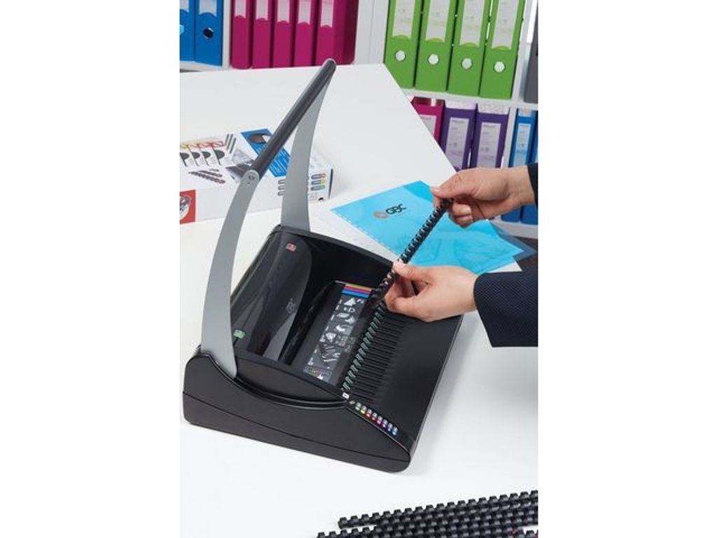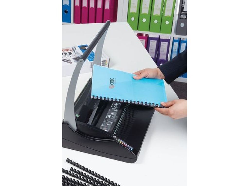 Alla dina regelbundna inbindningsbehov tillgodoses med CombBind C200 från GBC® GBC® CombBind C200 är perfekt för kontor med regelbundet behov av inbindning, har en stansningskapacitet på 20 sidor med lågkraftsstansning och EasyView™-indikator för pappersinriktning så att du kan förbereda dina dokument snabbt och smidigt. När du är beredd väljer du rätt spiral med den färgkodade storleksguiden, placerar de stansade A3-, A4- eller A5-sidorna på den förladdade spiralen och binder upp till 330 ark på en gång. Bindning är nu enklare än någonsin! - Med hjälp av en spiral på 38 mm kan du binda upp till 330 sidor - Stansa 20 ark 80 gsm-papper åt gången - Lätt vikt: Enkel att transportera och förvara - EasyView™-indikator för pappersinriktning förhindrar missad hålslagning - Binder A3-, A4- och A5-ark i stående format - Storlek: 130 mm x 340 mm x 395 mm - Lågkraftsstansning med fullängdshandtag - Färgkodad pappersstorleksguide för val av korrekt spiral - Med intelligent spiralöppnare för enkel laddning - Färg: svart