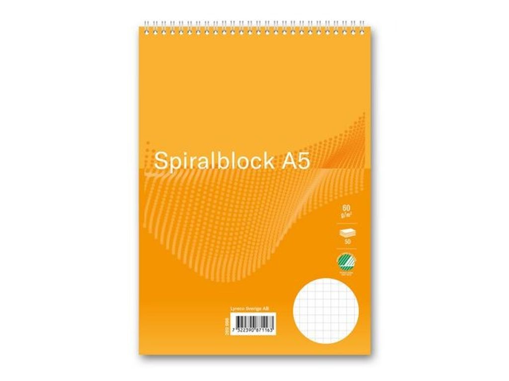 Beskrivning av Spiralblock FORMAT A5 60g 50bl rut Spiralblock i A5-format med rutade papper. Spiralbundna i överkant. Med vitt TF-papper. - 60g - 50 blad - A5 - Rutat - Träfritt papper