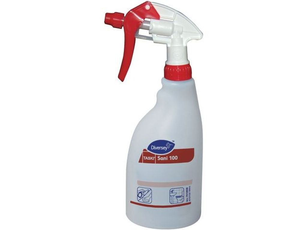 En återanvändbar och användarvänlig sprayflaska, märkt med Sani 100-etikett. Dessa förmärkta röda sprayflaskor är praktiska verktyg när du behöver på ett säkert sätt blanda lösningar med kemiska rengöringsmedel i lokalerna. Varje sprayflaska är märkt med Sani 100 W1b-etiketten som är lätt att identifiera. Där står produktens namn och användningsområden på flera språk, liksom bildikoner för att underlätta identifieringen. Den genomskinliga plasten gör det effektivt och enkelt att se hur mycket som finns kvar av produkten, samt att späda den. Flaskan är urformad för Sani 100, Taski-allrengöringsmedlet som kan användas för att rengöra och avkalka våtutrymmen och toaletter. Med den här mindre flaskan hanterar du enkelt mindre doser av den koncentrerade produkten. Du maximerar användningen utan risk för försämrad säkerhet. - Användningsklar sprayflaska, märkt för säkerhet - Ergonomisk flaskhals som är lätt att greppa och kontrollera - Mekanism för öppning och pump doserar konsekvent utan igensättning - Tydlig märkning som är lätt att identifiera och organisera - Förbättrar säkerheten - Färg: Röd - Kapacitet: 1 sprayflaska