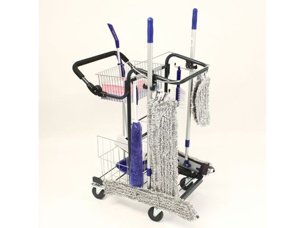 Städkit med vagn och tillbehör. Liten städvagn med komplett utrustning för det mindre städområdet. Städvagnen är stabil och har generöst med plats. Det reglerbara handtaget gör vagnen mer ergonomisk. Lättrullade 100mm hjul. - Innehåller: - 5 x 60cm torr/våtmopp+reglerbart skaft och stativ - 3 x 30cm torr/våtmopp+reglerbart skaft och stativ - Sopset - Dammvippa - Damm- och möbelborste - 10 x alltorkduk rosa och blå - 2 x microduk för glas - Klickskrapa - Dörrstopp - - Längd 69cm, bredd 49cm, höjd 106cm