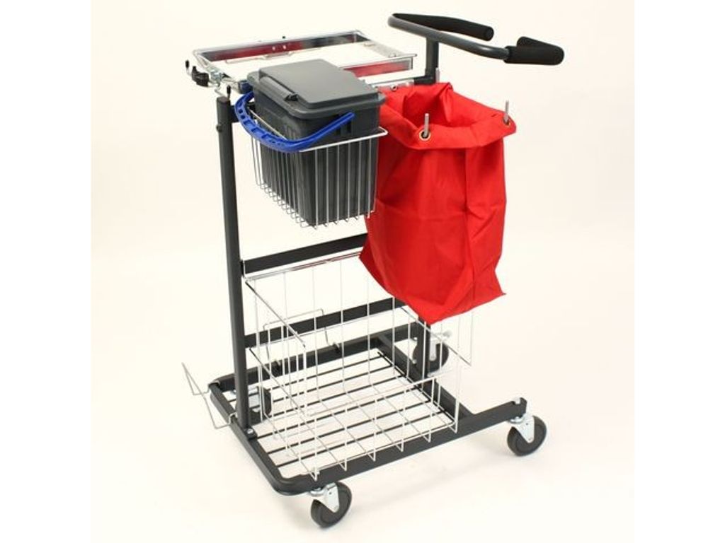 Städkit med vagn och tillbehör. Mellanstor städvagn med komplett utrustning. Städvagnen är stabil och har generöst med plats. Det reglerbara handtaget gör vagnen mer ergonomisk. Svensktillverkade 100 mm kullagerhjul. Mått: längd 71cm, bredd 63cm, höjd 92cm. Röda påsen 19 liter 36x19x28. - Innehåller: - Mjuka handtag - 6L hink - Tvättpåse med aktiv hållare - Trådkorg xl - Sopsäckshållare 70-125L - 2 x skafthållare+stativhållare - Krokar - Svensktillverkade Kullagrade 100mm hjul varav ett med broms.