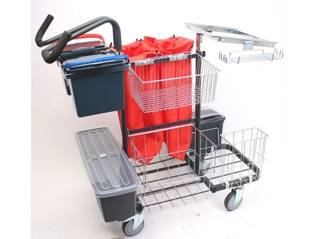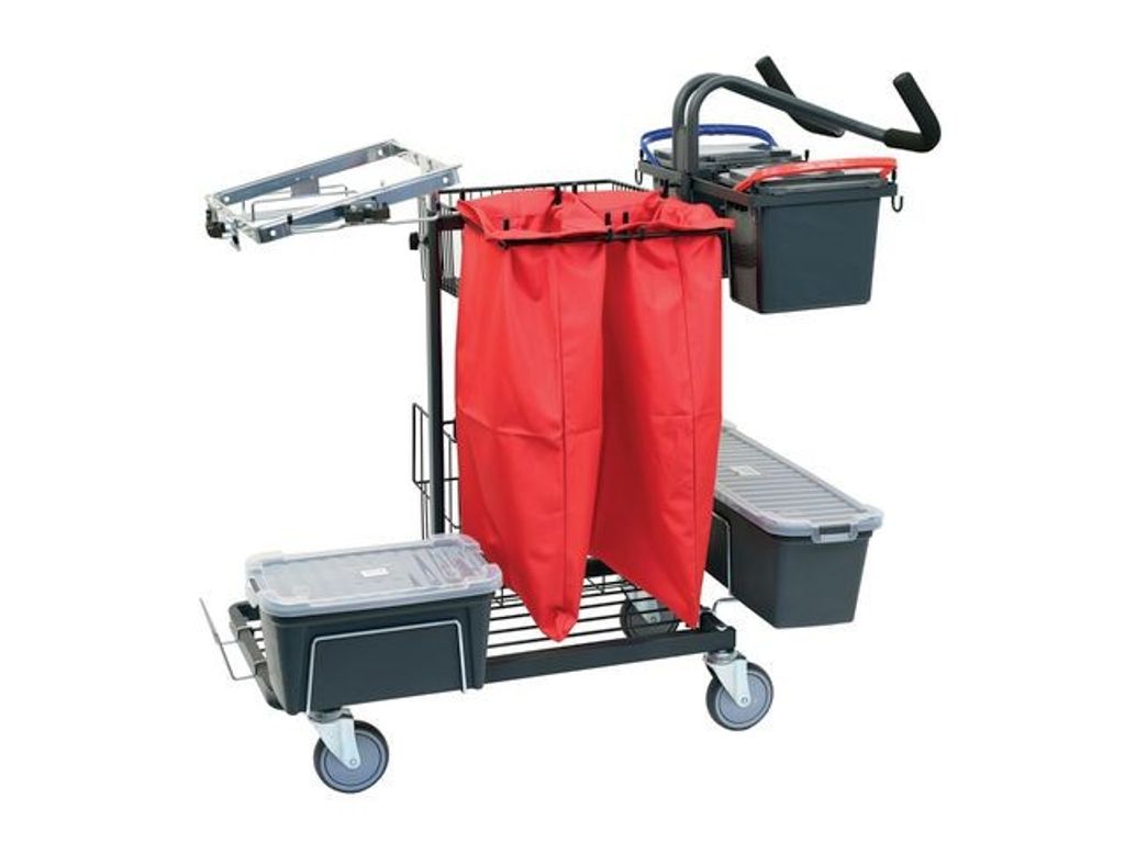 Städvagnen för dig som förpreparerar allt städmaterial i tvättmaskinen. Activa Metodvagn är en vagn med mycket generöst utrymme för material. . Den har bl a, reglerbara handtag, dubbla tvättpåsar, två 6-liters hinkar, tre stycken skafthållare och två stativhållare mm. Perfekt för större städobjekt som skolor, sjukhus, stormarknader etc. På vagnen finns två färgkodade hinkar med flipplock, två mopplådor med lock samt två stora tvättpåsar. Säckhållaren för 125-literssäck är steglöst reglerbar i höjdled. Hjulen har ny design och håller en hög kvalitet. De är lätta att rengöra, rullar lätt och tyst. Handtaget är steglöst reglerbart i höjdled och utrustat med softgrip för ett mjukt och skönt grepp. - Innehåller: 2 st 6l hinkar m hållare, moppbox liten och stor m lock, tvättpåse m hållare, påshållare, trådkorgar, säckhållare mm. - Mått (LxBxH): 1155x680x1120 mm