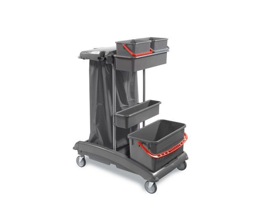 Med denna städvagn tar du städningen till en helt ny och högre nivå! EcoGreen Basic Mop är en liten multiservicevagn anpassad för lättare städning. Basenhet i återvunnen PP-plast. Vertikal stålram med handtag och med integrerad säckhållare. 2 skafthållare, 4 krokar, 2 hållare fixerade på den vertikala ramen för 2 plastkorgar. 4 st hjul i Ø 125 mm var av ett med broms. 2 st 6 liter plasthinkar i återvunnen plast. (grå med grått handtag/ grå med rött handtag). 1 st 22 liter plasthink. - 2 skafthållare, 4 krokar - 2 hållare fixerade på den vertikala ramen för 2 plastkorgar - 4 st hjul i Ø 125 mm var av ett med broms - 2 st 6 liter plasthinkar i återvunnen plast - 1 st 22 liter plasthink