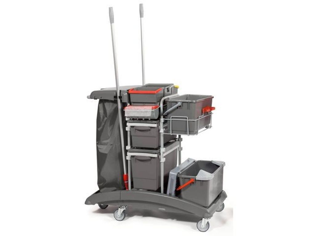 Med denna städvagn tar du städningen till en helt ny och högre nivå! EcoGreen Complete är en stor fullutrustad multiservicevagn för städning med mopp och utrustad med låsbara lådor för förvaring. Anpassad för Touch Free System. Basenhet i återvunnen PP-plast. Två vertikala stålramar med handtag och med integrerad säckhållare i 2 sektioner med lock som har dokumenthållare. 2 skafthållare, 4 krokar. 5 st hjul i Ø 125 mm var av ett med broms. - 2 skafthållare - 4 krokar - 5 st hjul i Ø 125 mm var av ett med broms