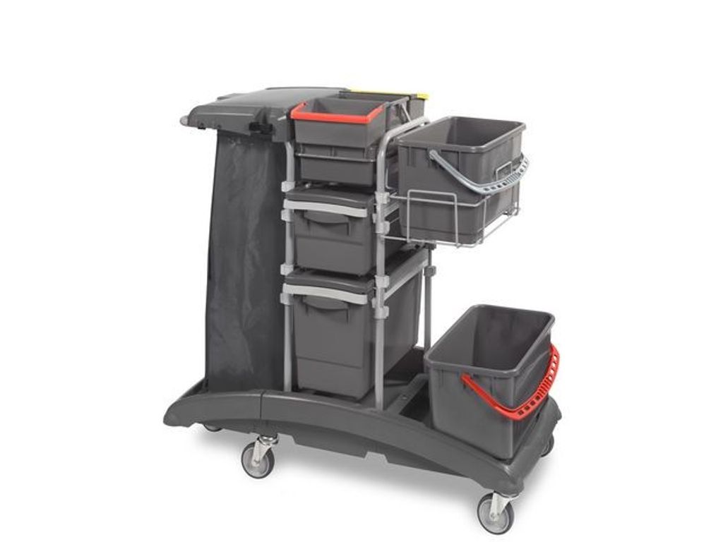 Med denna städvagn tar du städningen till en helt ny och högre nivå! EcoGreen Tray Mop är en stor multiservicevagn för städning med mopp och utrustad med låsbara lådor för förvaring. Tillverkad i polypropen/stål. Basenhet i återvunnen PP-plast. Två vertikala stålramar med handtag och med integrerad säckhållare. 2 skafthållare, 4 krokar. 5 st hjul i Ø 125 mm var av ett med broms. - 2 skafthållare - 4 krokar - 5 st hjul i Ø 125 mm var av ett med broms