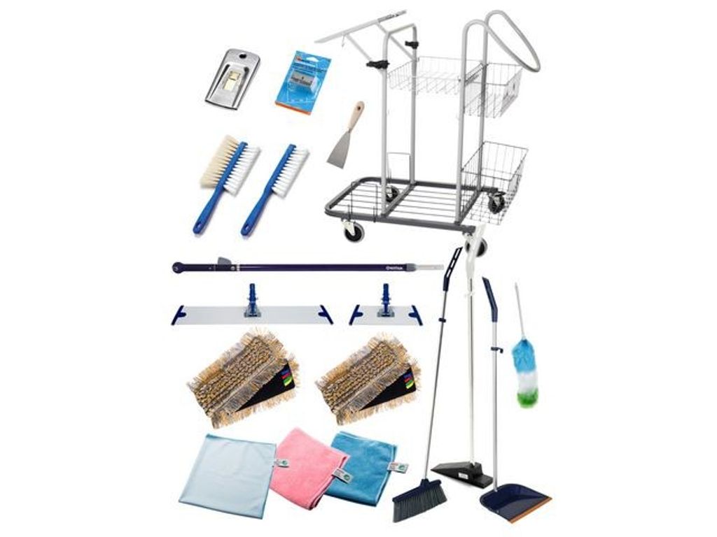Den här robusta städvagnen från Nordex har allt du behöver för att rengöra kontoret i en praktisk enhet. Maximera tid och arbete genom att använda det här väldigt effektiva rengöringssystemet. Den bärbara skurvagnen är utformad för att göra rengöring, förvaring, transport och rörlighet en bekväm och snabb upplevelse. Själva skurvagnen har flera nätkorgar som håller alla nödvändiga artiklar på plats. Ingår gör även alla nödvändiga städartiklar, från sopskyffel till trasor, moppar och borstar. Systemet har stöd för en rad olika rengöringstillämpningar och tillbehör för underhåll av byggnader. De slitstarka hjulen klarar av mångsidig terräng utan att bli hala eller ostabila. Den attraktiva men ändå simpla designen är kompakt och gör den enkel att använda. - Kompakt och effektivt skurvagnssystem med rengöringsprodukter - Inkluderar alla nödvändiga städartiklar, från sopskyffel till trasor, moppar och borstar - Sparar tid och ökar effektiviteten - Tålig och hållbar ram - Ergonomisk ram för enkel transport - Tillbehörshållare - Vagnmaterial: Metall