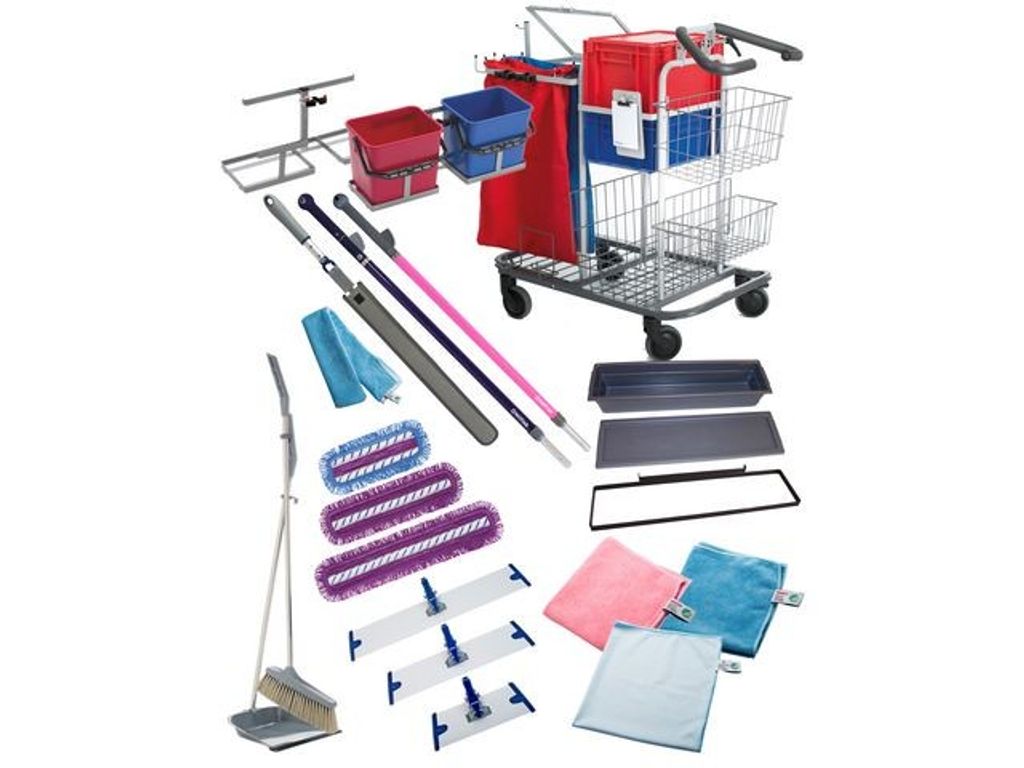 Den här robusta städvagnen från Nordex har allt du behöver för att rengöra kontoret i en praktisk enhet. Städvagnen från Nordex är det kompletta rengöringssystemet för rengöring av kontor med dess robusta konstruktion och mångsidiga tillbehör. Du kan rengöra golv, fönster, toaletter, badrum, skrivbord och mer därtill med den här välorganiserade men ändå kompakta städvagnen som enkelt glider fram på 4 hjul. Den har hinkar och behållare samt en kvast och handtag samt tillbehör i olika storlekar för våta och torra moppar. Det finns även en nätförvaringshylla under behållarna så att du enklare och snabbare kommer åt artiklar som används lite oftare, som t.ex. svampar och trasor. Städvagnen kan skjutas eller dras i dess plasthandtag och det ingår även ett anteckningsblock. - Stabil städvagn på 4 länkhjul - Perfekt för städarbete på kontoret - Innefattar en rad olika rengöringstillbehör - Praktiska behållare för förvaring och hinkar för tvättning - Tillbehör för våta och torra moppar i olika storlekar - Mått: Liten - Färg: Silver
