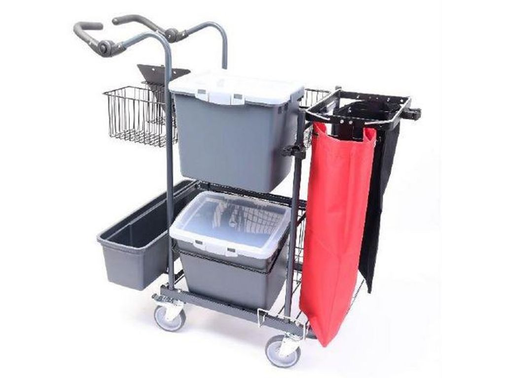 Ergonomisk reglerbart handtag med mjukt grepp. 2st 25l back med snäpplock. 4st trådkorg, total volym ca 80l. Stor svart och röd tvättpåse. Plats för 3 stativ. Tröskelklättrare och mopplåda 60cm. 125mm kvalitétshjul för inom och utomhusbruk varav ett med totalbroms. Skrivplatta och flaskhållare. - Mått: (LxBxH) 105 x 68 x 112 cm