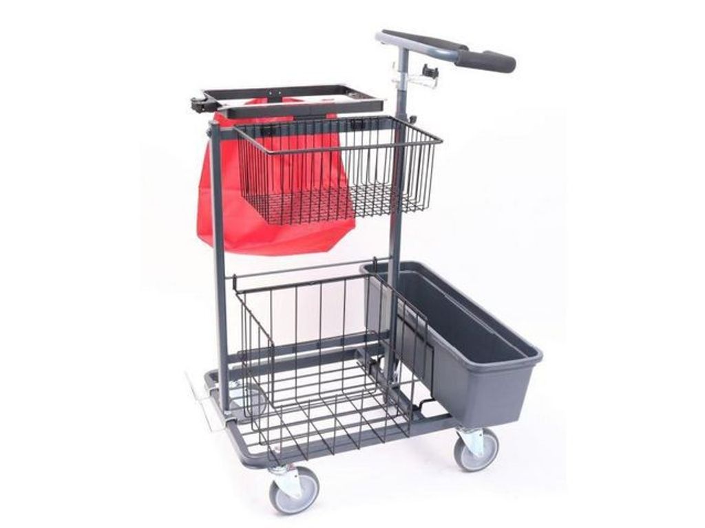 Städvagn med ergonomiskt reglerbart handtag. Trådkorg x 2st total volym ca 65l. Tvättpåse liten röd. Plats för 2 stativ. Tröskelklättrare och mopplåda 60cm. 125mm kvalitetshjul för inom och utomhusbruk, varav ett med totalbroms. Reglerbart handtag med mjukt grepp. - Mått: (LxBxH) 68 x 68 x 100 cm
