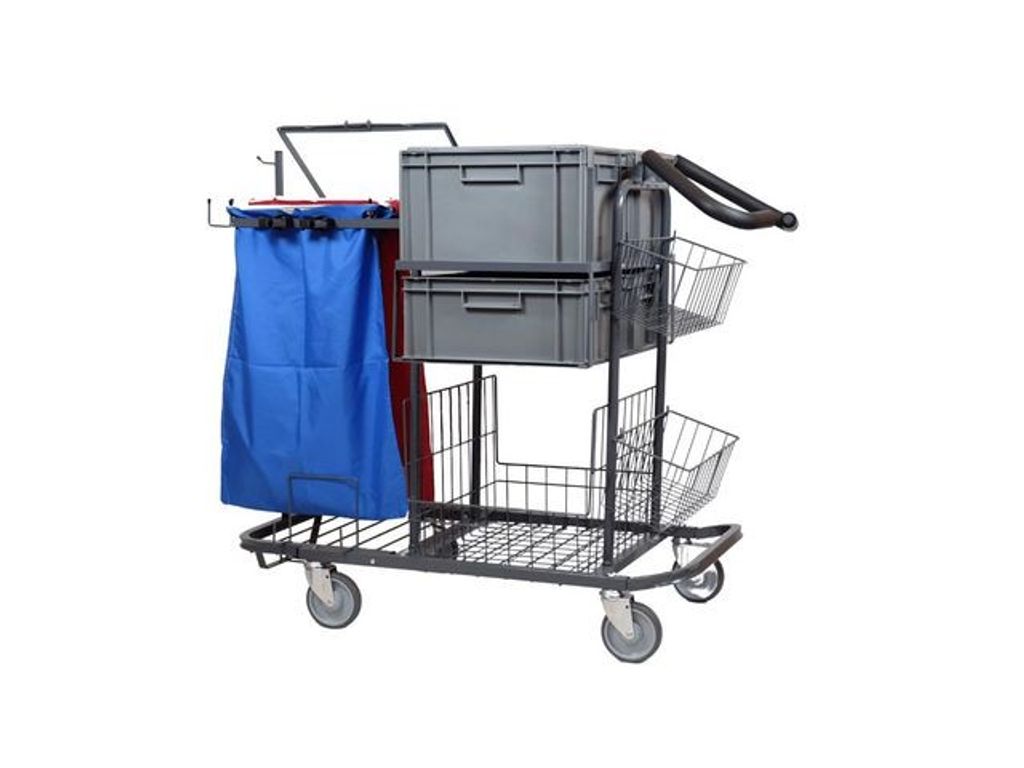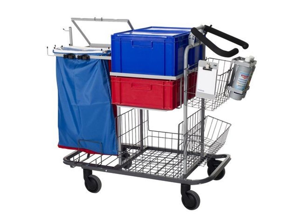 Stor och ergonomisk vagn med generösa utrymmen för utrustning. Komplett med 3st korgar, tröskelkrypare, sopsetshållare, 2st 20l backar, 2st 15l backar, 2st tvättsäckar, 2st tvättnät. Vagnen är av hög kvalitet, robust och ergonomiskt utformad för moderna städmetoder. Systemvagnen har plats för stora förvaringsbackar och mycket utrustning. Vagnen är anpassningsbar för de flesta städområden. S2-Systemvagn Stor har en tröskelkrypare som är ergonomisk och lätt att använda. Handtaget är justerbart i två lägen. Med de lättkörda tysta hjulen så styr du vagnen ergonomiskt och lätt i ditt dagliga arbete. Flaskhållare (lev.nr. 62600542) och skrivplatta (lev.nr. 62600543) är tillbehör och köps separat. - Ergonomisk - Unik tröskelkrypare - Lättkörda designade hjul - Mått: L 1000 mm, B 615 mm, H 1090 mm