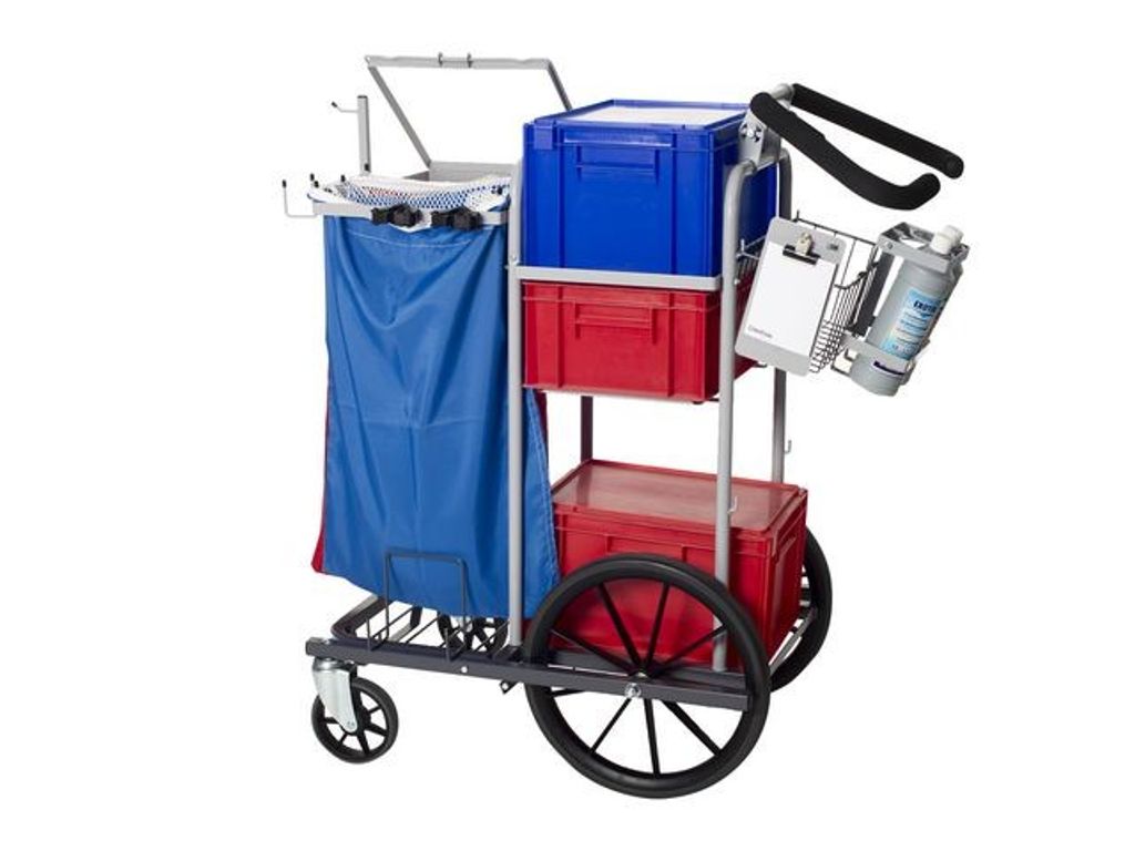 Komplett utrustad med följande tillbehör: 2 röda 20 liters (art.nr 1533839) samt 1 blå 15 liters (art.nr 1533840) back med löstagbara lock, 1 röd (art.nr 1533845) samt 1 blå (art.nr 1533844) moppsäck, 2 tvättnät (art.nr 1533846), 1 flaskhållare (art.nr 1533822) och 1 skrivplatta (art.nr 1533823). De stora robusta hjulen gör vagnen smidig att hantera i framför allt trappor men fungerar lika bra när vagnen ska förflyttas mellan fastigheter, över höga trösklar eller med snöslask som underlag. Vagnen kan även utrustas med fasta framhjul för bättre stabilitet på ojämna underlag. Greppvänligt, reglerbart och mjukt handtag som ger stora möjligheter till varierande körställningar. Mått: L920xB560xH1110 mm.