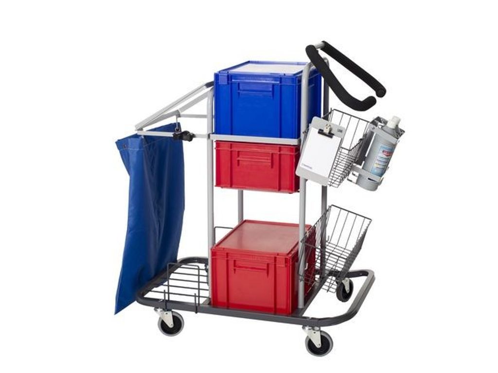 Komplett utrustad med följande tillbehör: 1 blå 20 liters back (art.nr 1533838), 1 blå 15 liters back (art.nr 1533840) samt 1 röd 20 liters back (art.nr 1533839) med löstagbara lock, 1 röd moppsäck (art.nr 1533845), 1 flaskhållare (art.nr 1533822) och 1 skrivplatta (art.nr 1533823). Liten och smidig städvagn för små städytor. Greppvänligt, fast lutande handtag. Flexibel med hjälp av många tillbehör. Mått: L698xB540xH1030 mm.