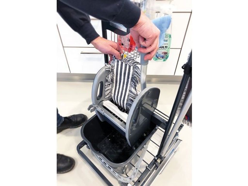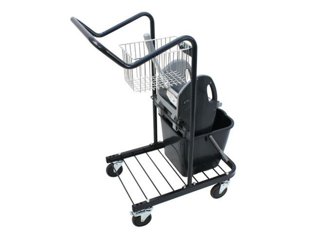 Beskrivning av Städvagn Speedo Exclusive 1 En liten städdvagn med mopp-press, skafthållare och korg för kem eller redskap samt plats för sopsäck. Robust svabbvagn. Lätt att manövrera. Lättrullade 100 mm hjul. Mått (LxBxH): 720x430x973mm Svensktillverkad