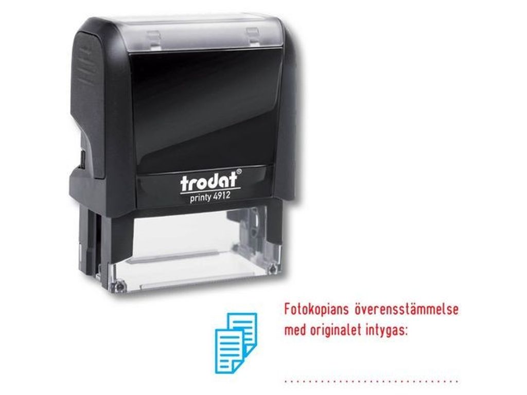 Klimatneutral stämpel med standardtext. Stämpel med standardtexten: Fotokopians överenstämmelse med originalet intygas av, och en linje för underskrift. Stämpeln har en mycket enkelt utbytbar dynkassett. - Enkel att byta kassett - Förenklar och förtydligar vart underskrift ska göras