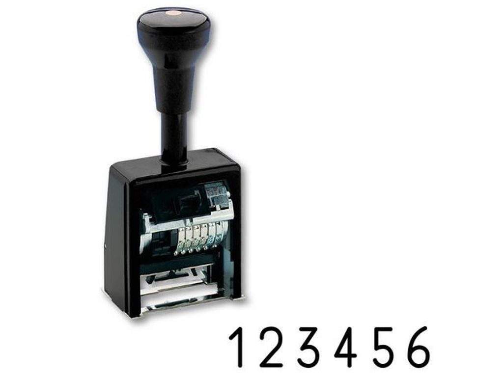 Beskrivning av Stämpel REINER B6K, 6 hjul 5,5 mm Numreringsstämpel med en enkel utbytbar dynkassett. Stämpeln har flera växlingsmöjligheter. - Enkel att byta