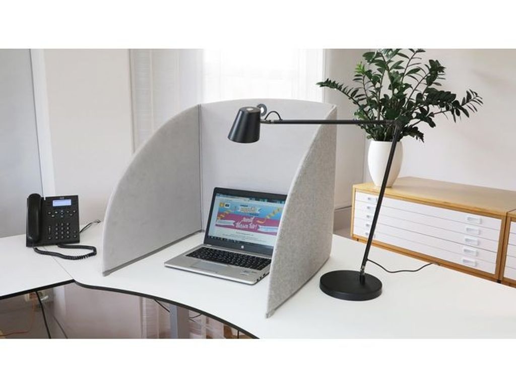 Bordsskärm som skapar avskildhet och bidrar till en lugnare miljö. Bordsskärmen dämpar ljud och skärmar av ytor där det behövs. Kärnan består av en stabil och återvinningsbar kanalplast. Bordsskärmen är klädd i ett grått, melerat tyg med tuftad look. Invändigt är den klädd med alcantara-liknande tyg som finns i fyra olika färger. Smart öljett som gör att skärmen kan hängas upp då den inte används. - Hopfällbar - Tyg utvändigt 80% polyester, 20% viskos - Invändigt tyg 90% polyester, 10% bomull - Färg: Grå - Mått: 58x55x55 cm