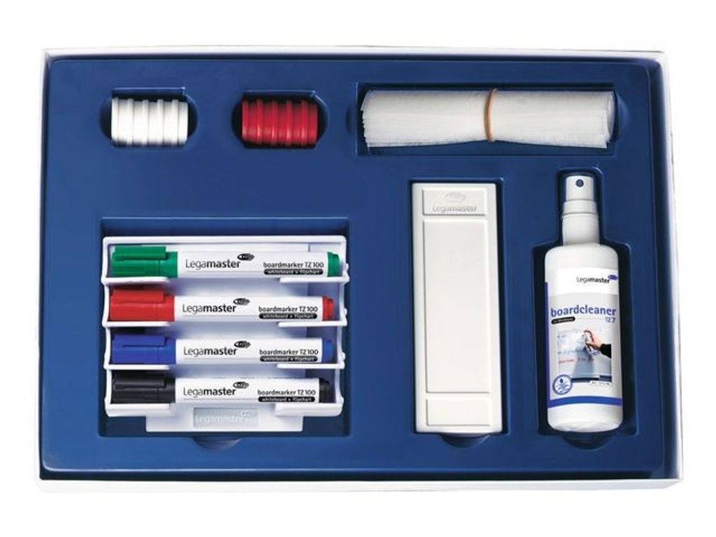 Tillbehör för whiteboardtavlor! Komplett kit med högkvalitativa tillbehör för whiteboards. Pennor: 4 TZ100 whiteboardpennor (en av varje: svart, röd, blå, grön). Pennhållare: 1 magnetisk pennhållare för förvaring av 4 pennor. Radering: 1 liten taveltorkare för whiteboardtavlor plus 10 biologiskt nedbrytbara torkdukar. Rengöringsmedel: 1 TZ7 rengöringsmedel för whiteboard och glastavlor (125 ml). Magneter: 10 magneter (diam. 30 mm). Fast, återförslutningsbar kartong med separata fack för de olika tillbehören. - 27 delar