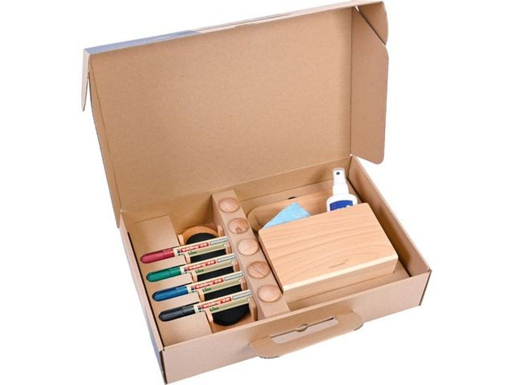Snyggt med naturligt trä! Perfekt startpaket med massvis av bra och fina tillbehör. Innehåller 1x taveltorkare i trä, 3x refillpads för taveltorkare, 1x tillbehörsbox i trä, 1x pennhållare i trä för whiteboardpennor, 5x magneter i trä, 4x edding 28 EcoLine whiteboardpennor (svart, röd, blå, grön), 1x TZ7 whiteboard rengöringsmedel 125 ml, 1x mikrofiberduk 40x40 cm. Alla medföljande tillbehör är lämpliga för magnetiska whiteboardytor. Trädelar av bok med lackering. Varje WOODEN produkt är unik i färg och utseende eftersom det är tillverkat av naturligt trä. De medföljande, påfyllningsbara pennorna är klimatneutrala eftersom de är tillverkade av 90 % återvinningsbara material. Till och med 83 % av de använda materialen är plast efter konsumtion, till exempel använda yoghurtmuggar eller vattenkannor. - Starterkit med 17 delar