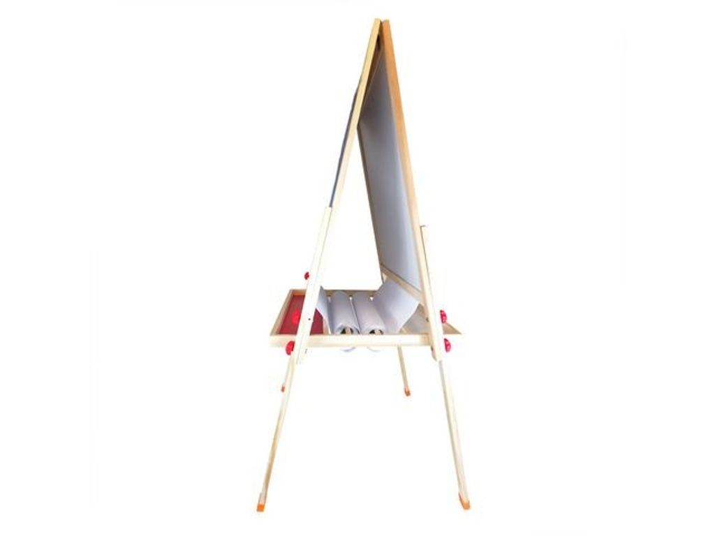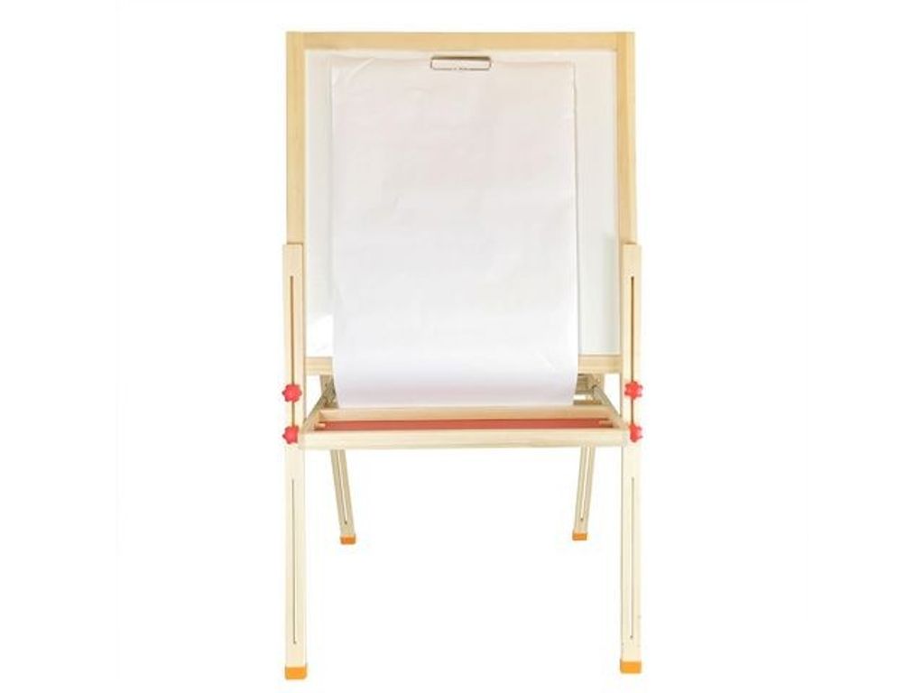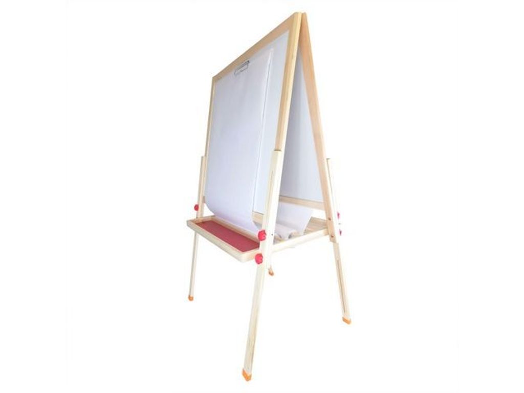 Beskrivning av Ståstaffli Dubbelsidig Stadigt, dubbelsidigt ståstaffli med stora whiteboardtavlor 59x59 cm. - Justerbart mellan 110-146 cm - För både rulle och ark - Största rullbredd 50 cm - Tillverkad av Furu