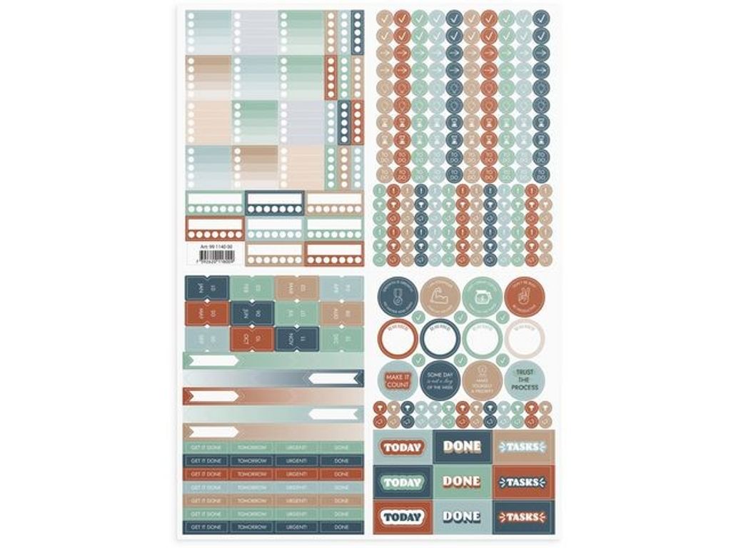 Stickersark i papp, A4-format, med alla stickers du kan tänkas behöva till att pynta din kalender med. Om du saknar någon funktion i kalendern eller vill lägga extra uppmärksamhet på en speciell dag i din kalender är det här de bästa stickerserna. Matt papper, lätt att skriva på. - Format ark: 210x297 mm (A4, vikt i A6-format. - Miljöinformation: FSC®.