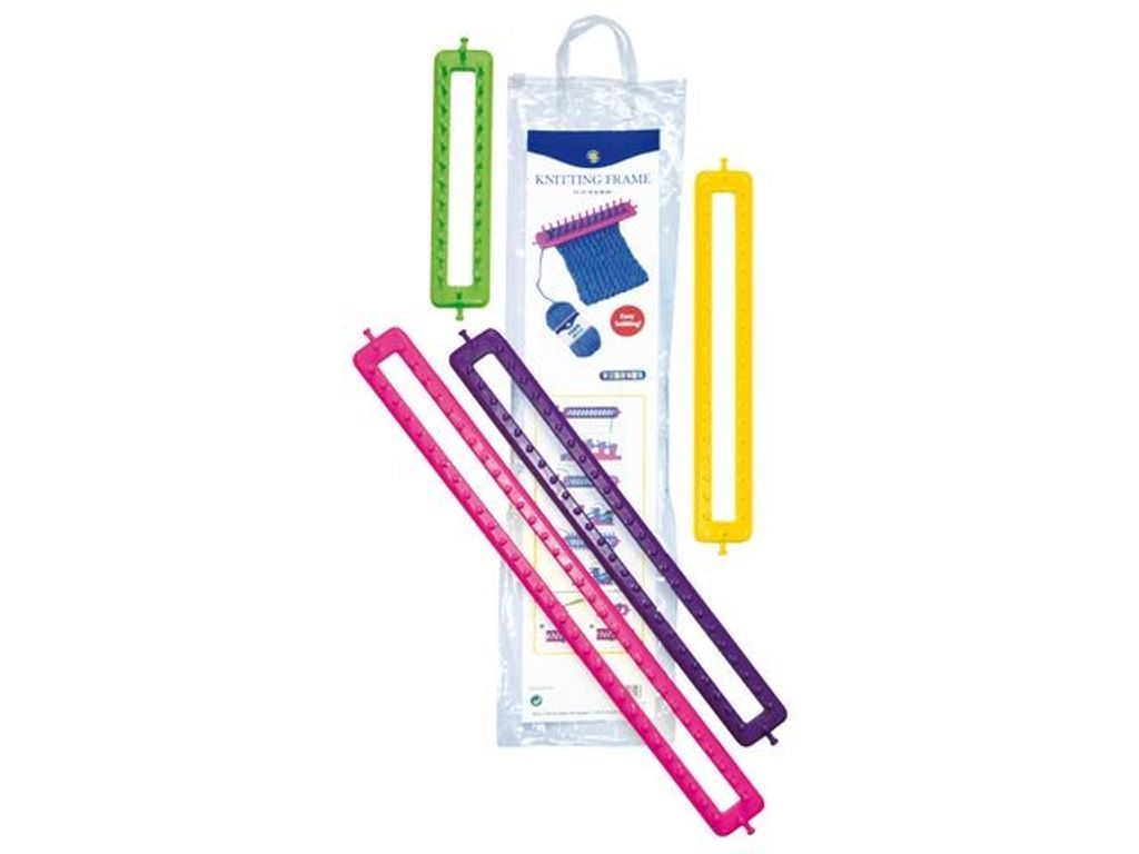 Stickramar av plast i olika storlekar. Läs den medföljande instruktionen och kom snabbt igång med stickningen. Vi rekommenderar akrylgarn till detta. Innehåll: - Nål - Krok - 4 st Stickramar - Mått: 27, 37, 47, 58 x 5,5 cm - Färg: Rosa, lila, gul och grön - Material: ABS