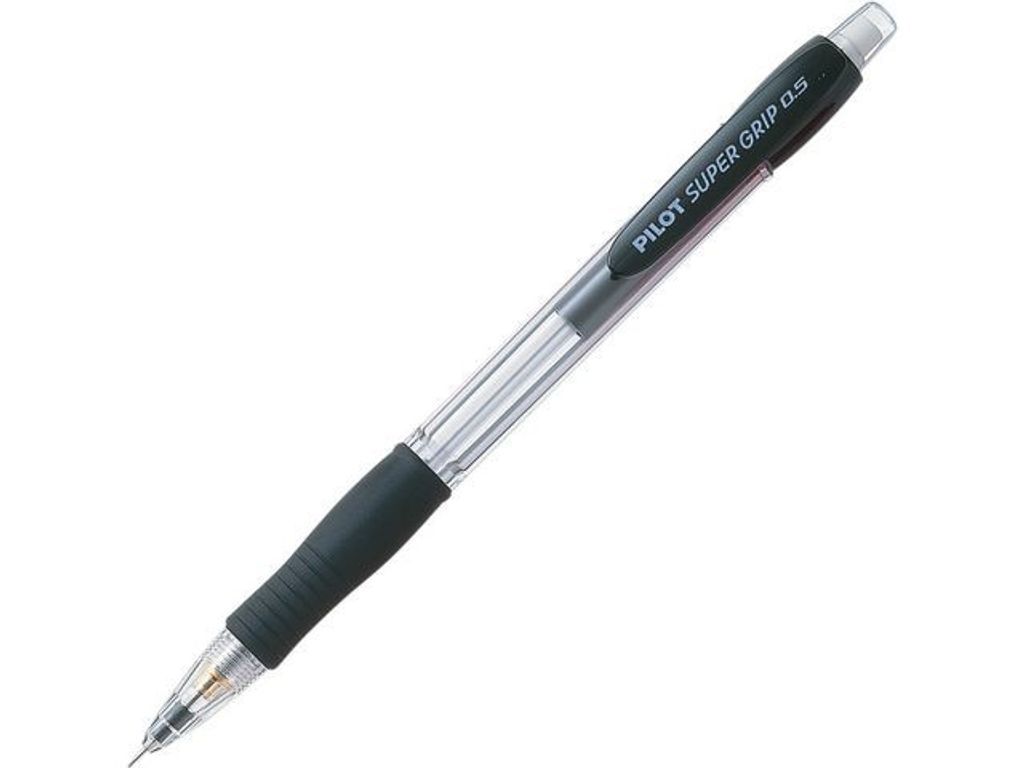 Pilots mekaniska Super Grip-stiftpenna har gummigrepp och svängd pennkropp och en rolig, färgglad design. Pilots mekaniska Super Grip-stiftpenna har en ljus och färgglad design som passar fint överallt på kontoret, hemma eller i klassrummet. Spetsen på 0,5 mm låter dig dra tunna linjer vilket passar för uppgifter som kräver smidighet och precision. Spetsen kan dras in helt i kroppen, vilket gör pennan enkel att bära med sig i fickan. Den här automatiska pennan har en transparent pennkropp som gör att du kan se när blyertsstiftet håller på att ta slut. Den har dessutom med ett inbyggt radergummi.Den automatiska pennans blyertsstift och radergummi är påfyllningsbara, vilket ger mindre avfall och större besparingar. - Klickmekanism - Med suddgummi - Spetsbredd: 0,5 mm - Hårdhetsgrad: HB - Färg pennkropp: Transparent/Svart