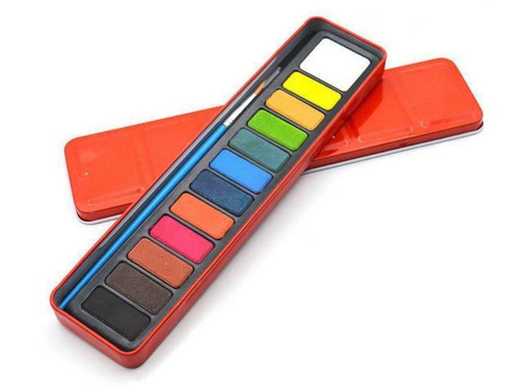 Akvarellåda i plåt som innehåller 12 rektangulära akvarellfärger i klara kulörer. Akvarellfärgerna ger ett transparent intryck och bör spädas rikligt med vatten. Akvarellfärg målas med fördel på tjockare papper, t ex akvarellpapper i block eller lösa ark. - Varning. Lämpar sig inte för barn under 3 år