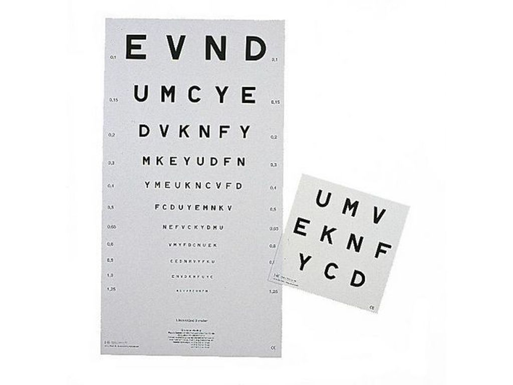Synskärpe- och pektavla med läsavstånd på 3 meter. Syntavla EVND 3m består av synskärpetavla och pektavla. EVND-tavlan passar i Belysningslåda HE-Mini och i Belysningslåda HE-Universal. Tillverkad i vit ytbehandlad plast. - Läsavstånd 3 meter - Graderad synskärpa 0,1 - 1,25 - Mått: 320 x 600mm
