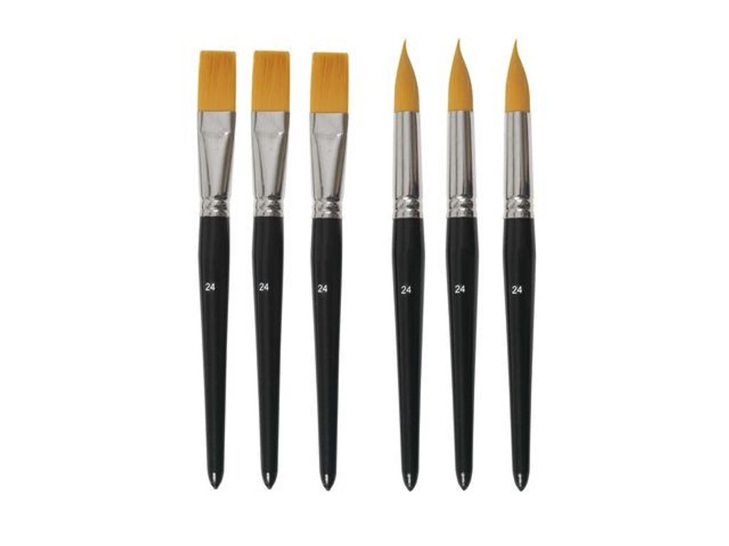 Set med runda och flata penslar av syntetmaterial med lackerat skaft. Låt kreativiteten flöda med hjälp av syntetiska penslar. I detta set får ingår både runda och flata penslar med nr 24. Så skapa både tunna och tjocka linjer, dramatiska konstverk och fina detaljer. - Antal: 6/FP - Form: flata och runda - Storlek: 24 - Material: FSC-certifierat behandlat trä, aluminium och nylon